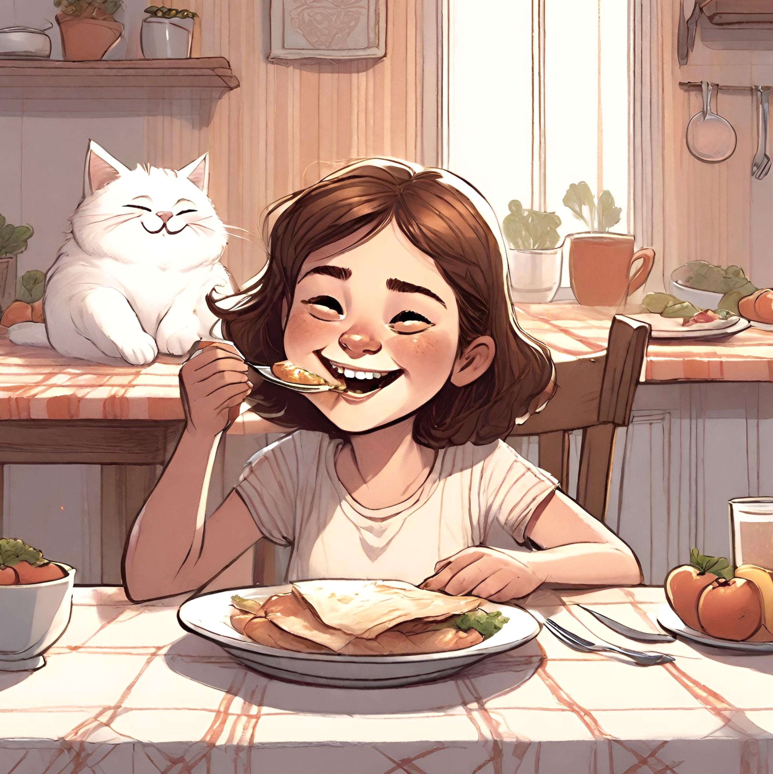 När hon sitter vid bordet och äter. Då ligger Sigge på bänken och myser. Ibland hoppar han ner och sätter sig intill henne på golvet. Sen lägger han tassen på Märtas fot. Då vill han smaka ost eller något annat gott.