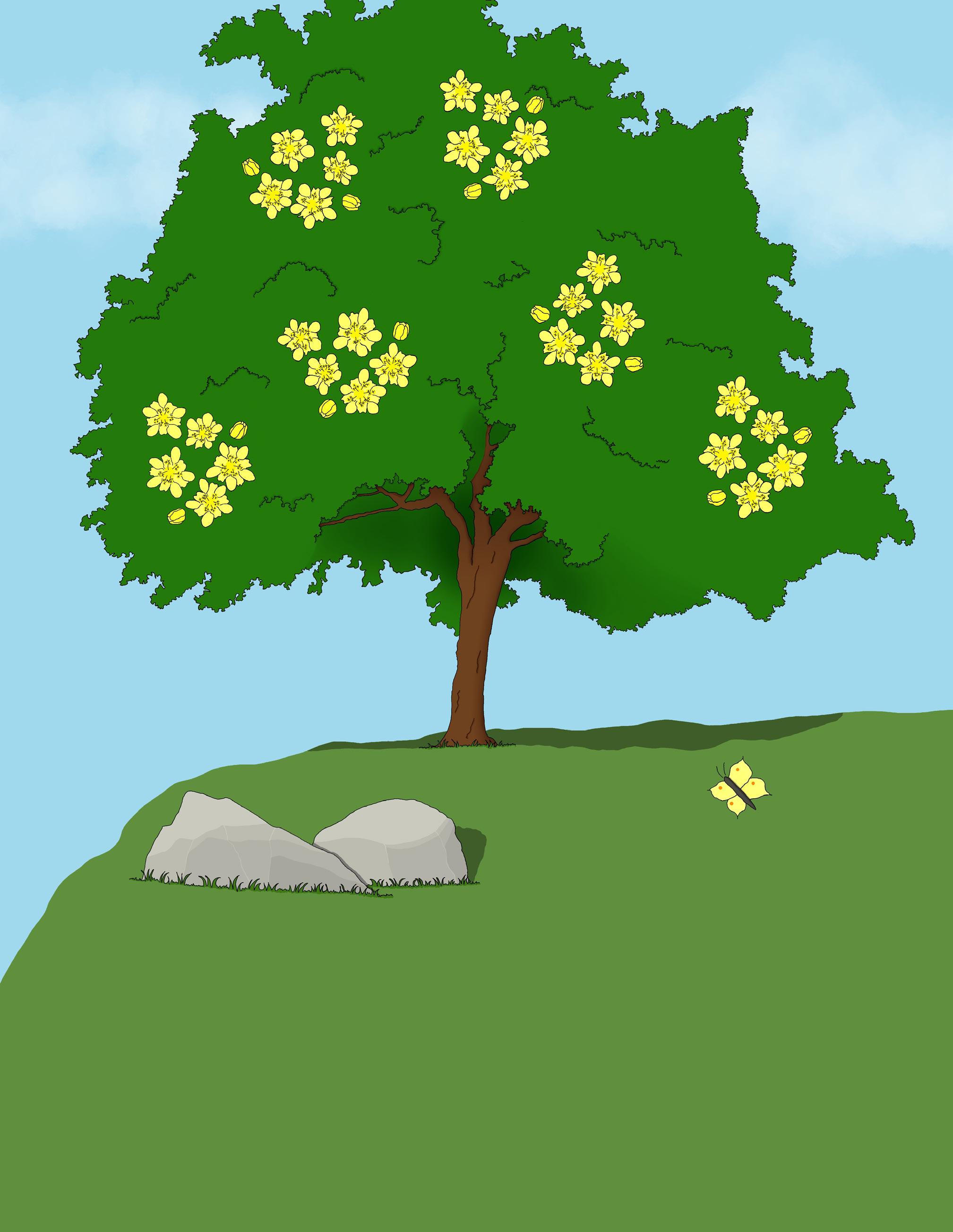 Hon flög iväg med sina vänner och strax de fann en ståtlig lönn så grön och grann.