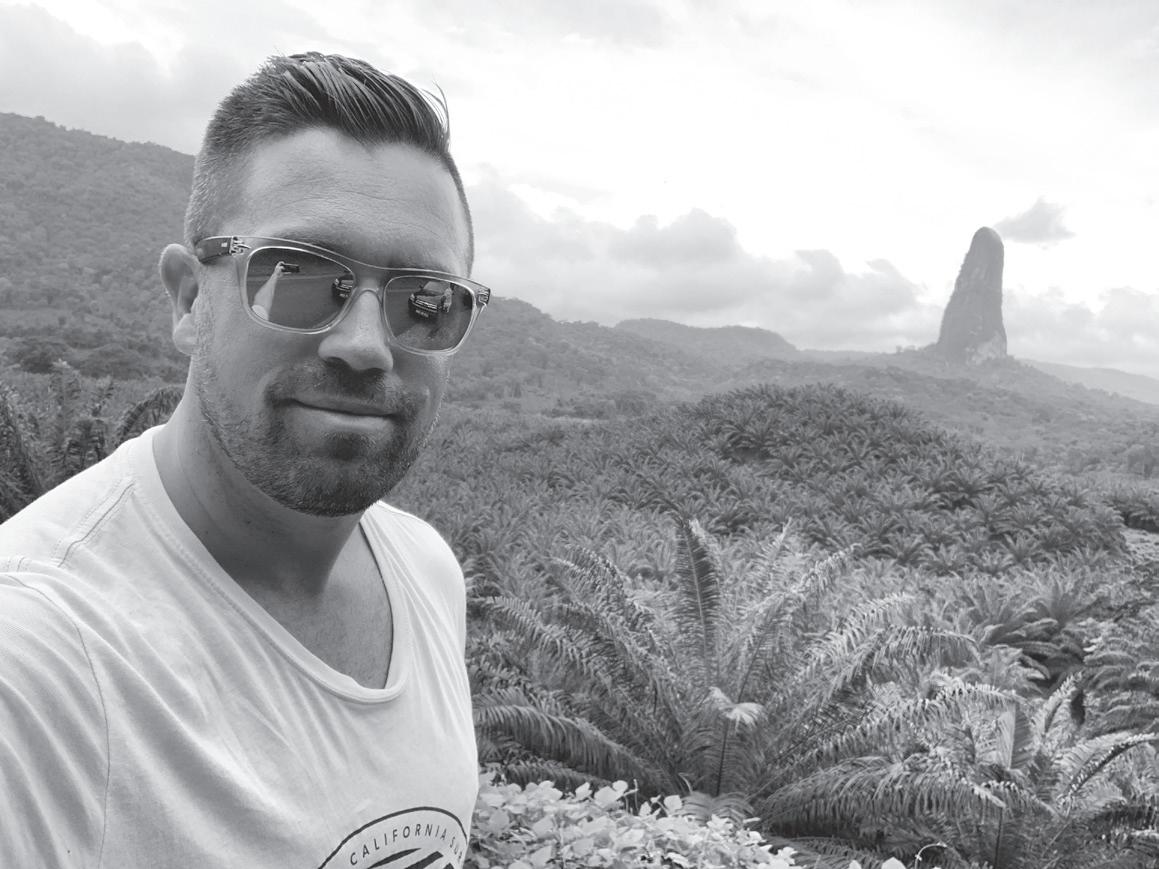 Framför Pico Cão Grande (”Stora hundberget” på portugisiska) som är ett känt landmärke i den afrikanska önationen São Tomé och Príncipe. Branta sluttningar och hög närvaro av giftormar gör det till ett av de farligaste bergen i världen att bestiga.