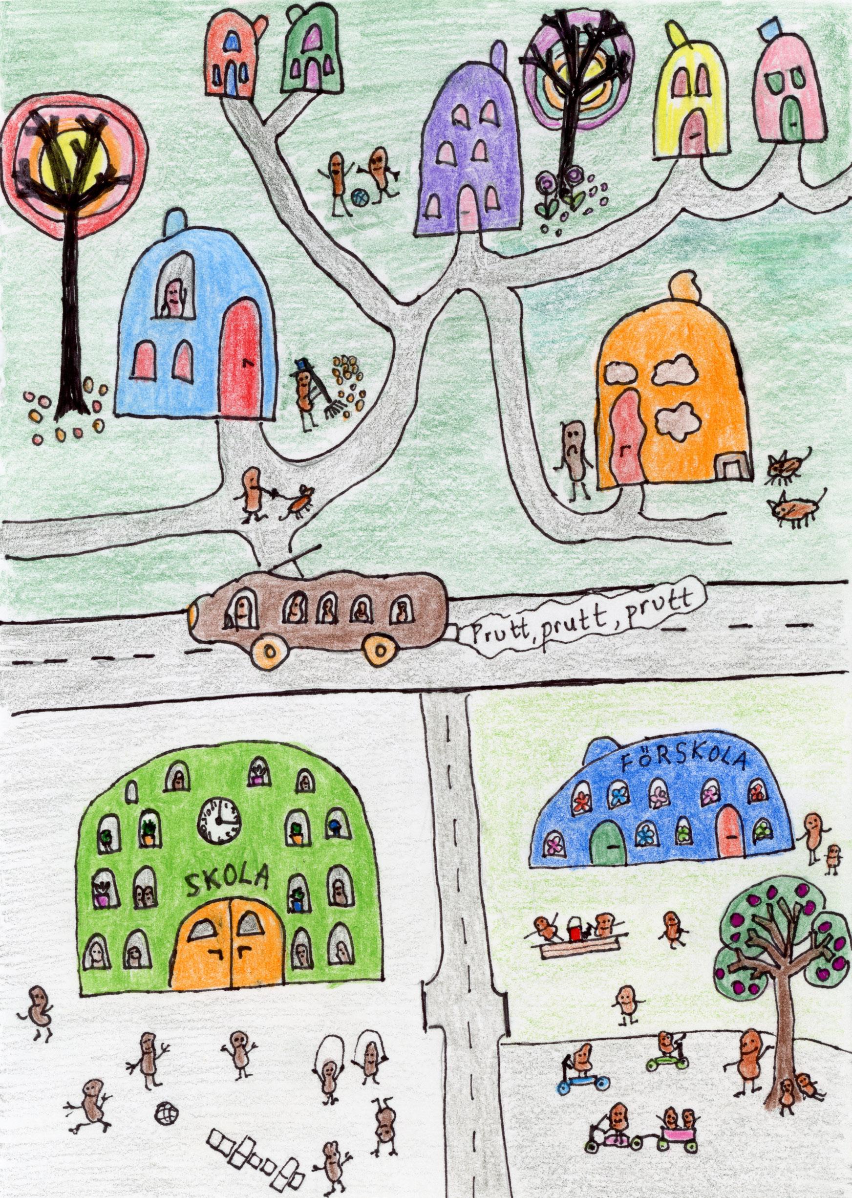 Bruno ser att det finns många barn och de har roligt och skrattar när de leker. Berit berättar för Bruno att det finns en buss som pruttar fram i staden. Den kan man åka med om det är för långt att gå någonstans. Bruno kan se att det finns fina trädgårdar och många träd i staden och att bajskorvarna som bor här ser snälla ut.