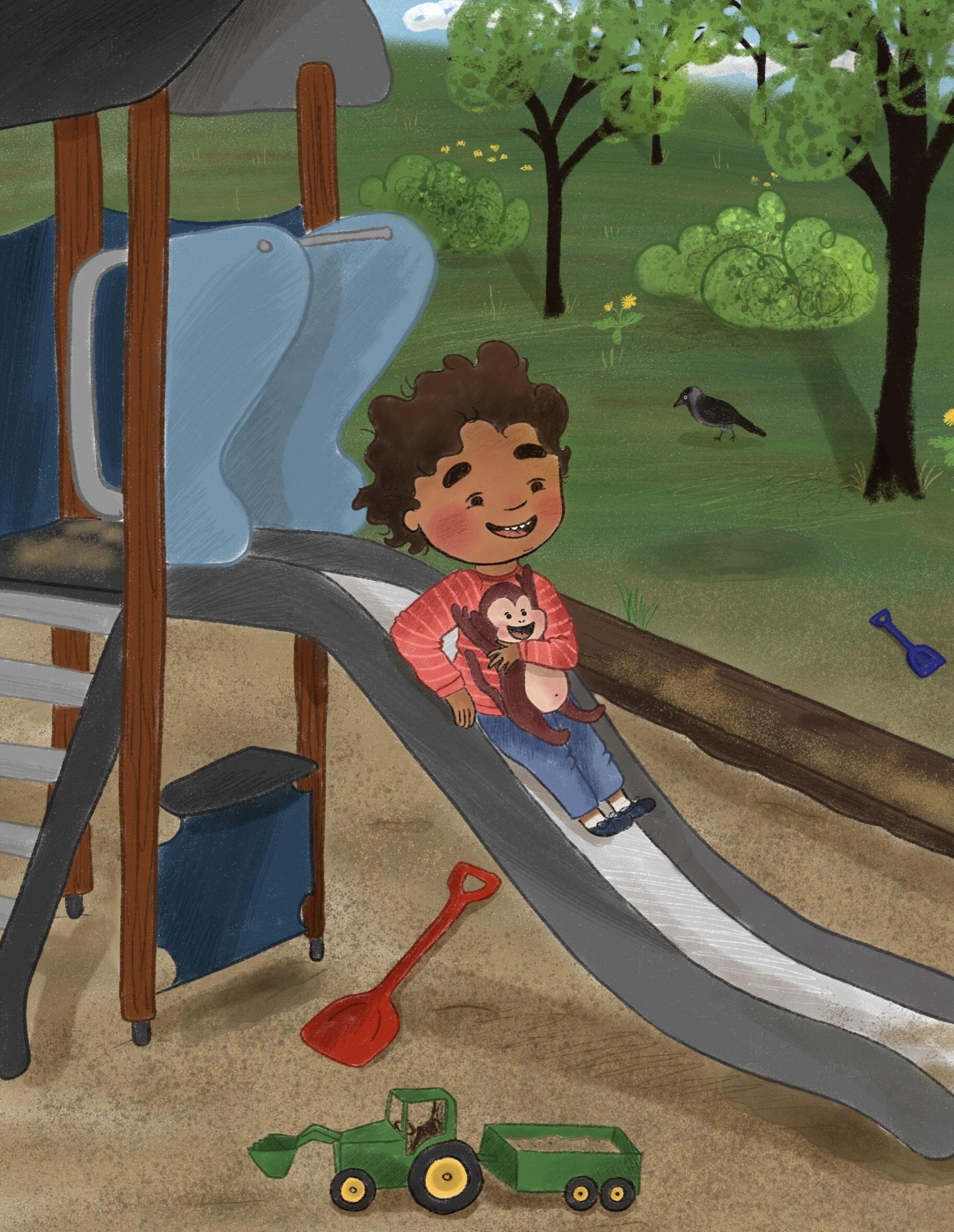 Han känner sig trött, men när de kommer fram vill Jamie gunga och åka rutschkana.