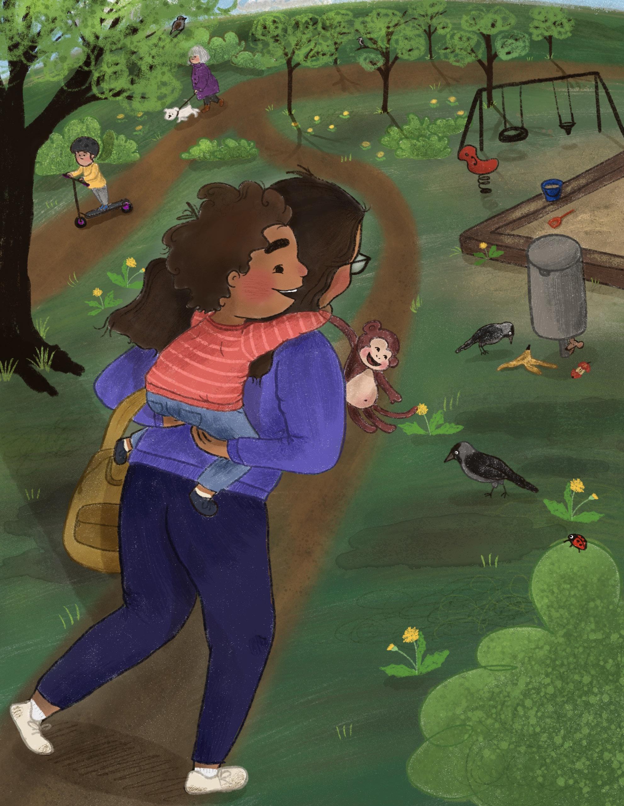 På vägen blir Jamie trött. Han får rida på mammas rygg.