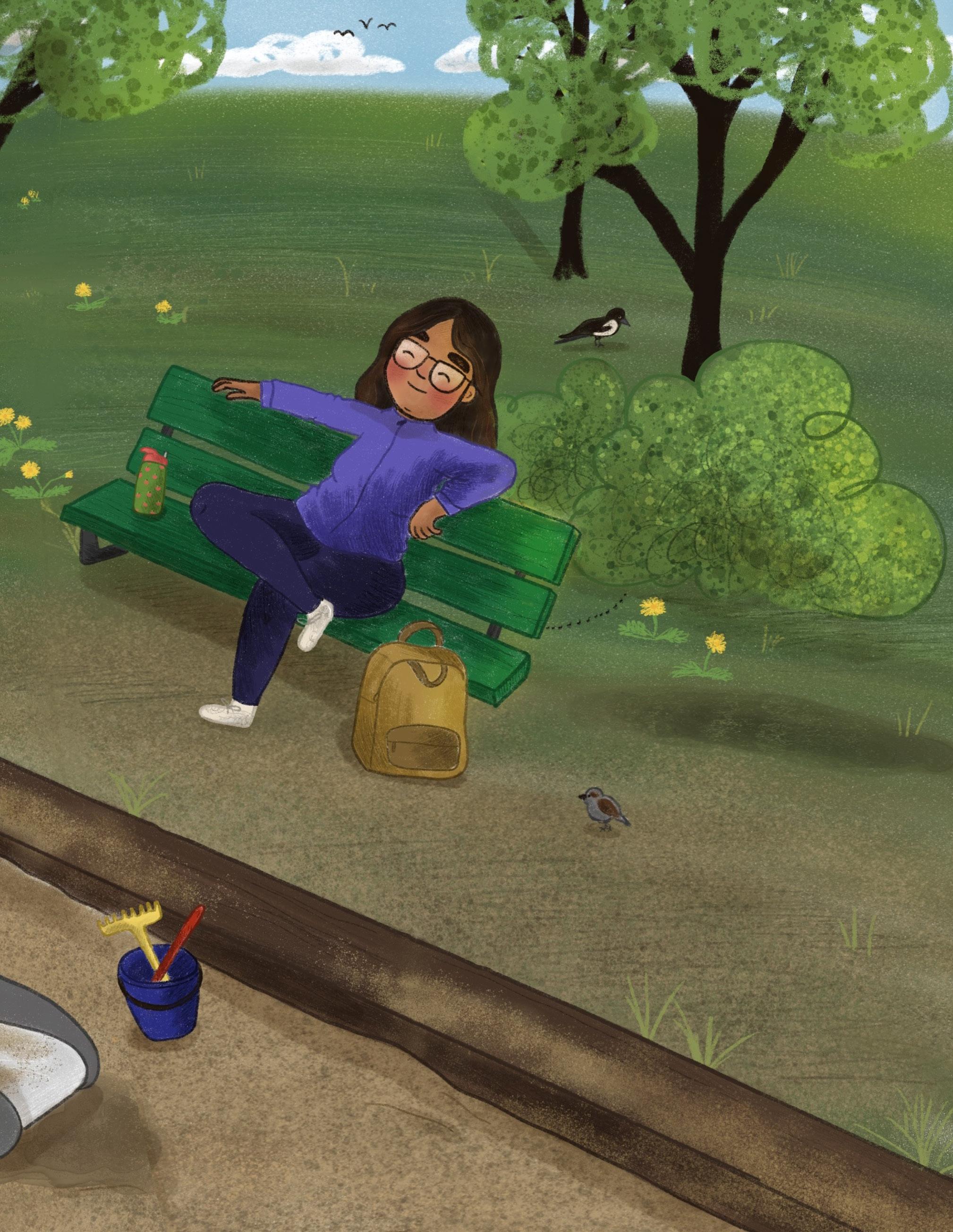Mamma sitter och njuter i solen. Vilken härlig dag!