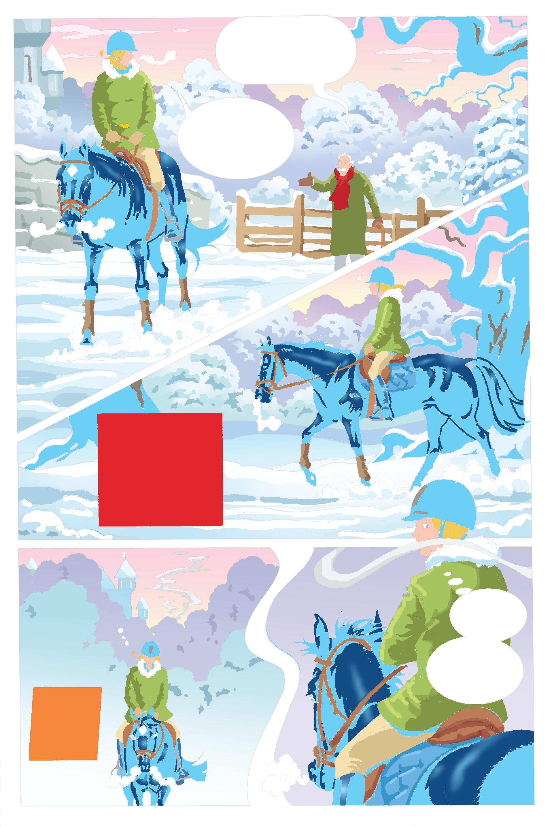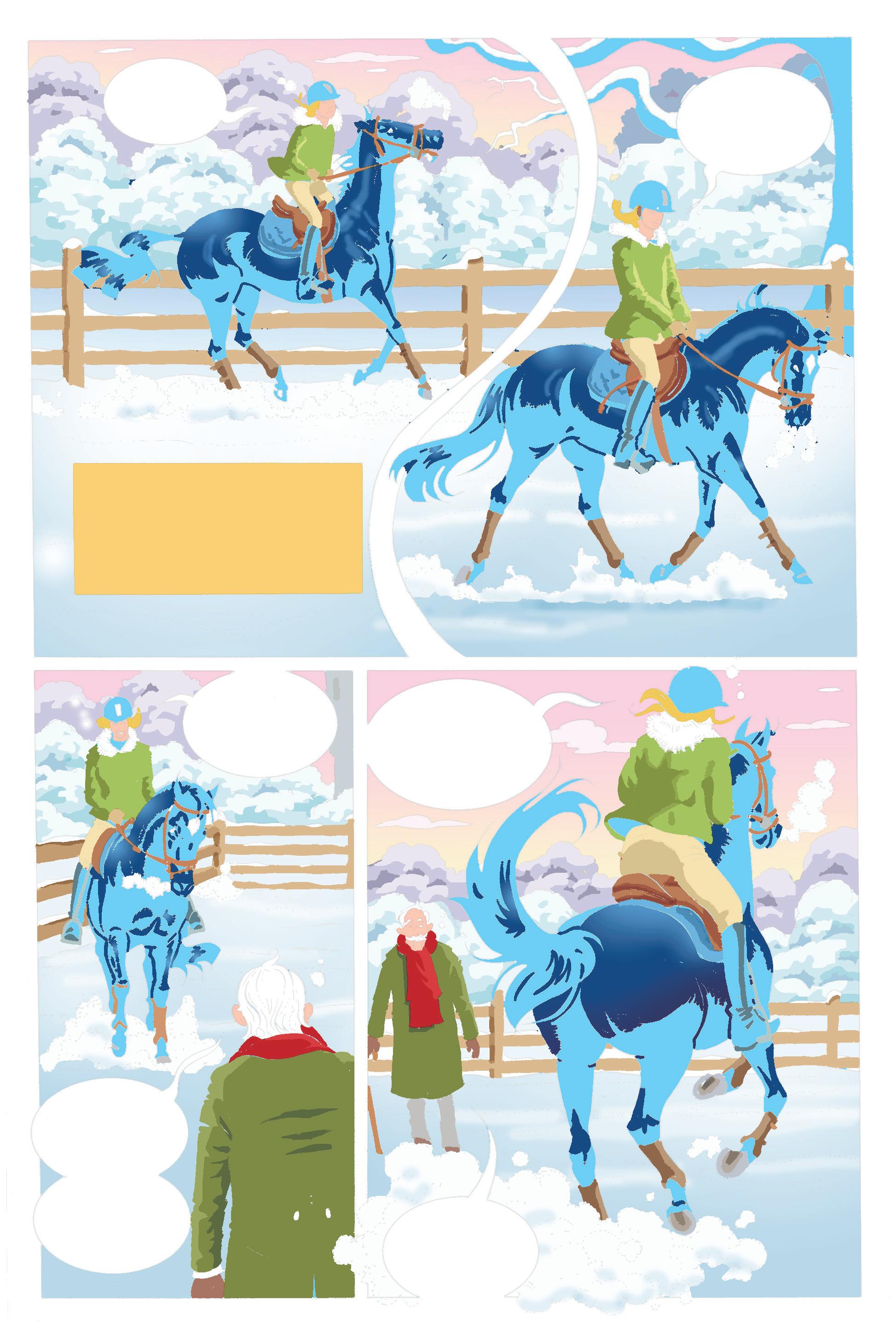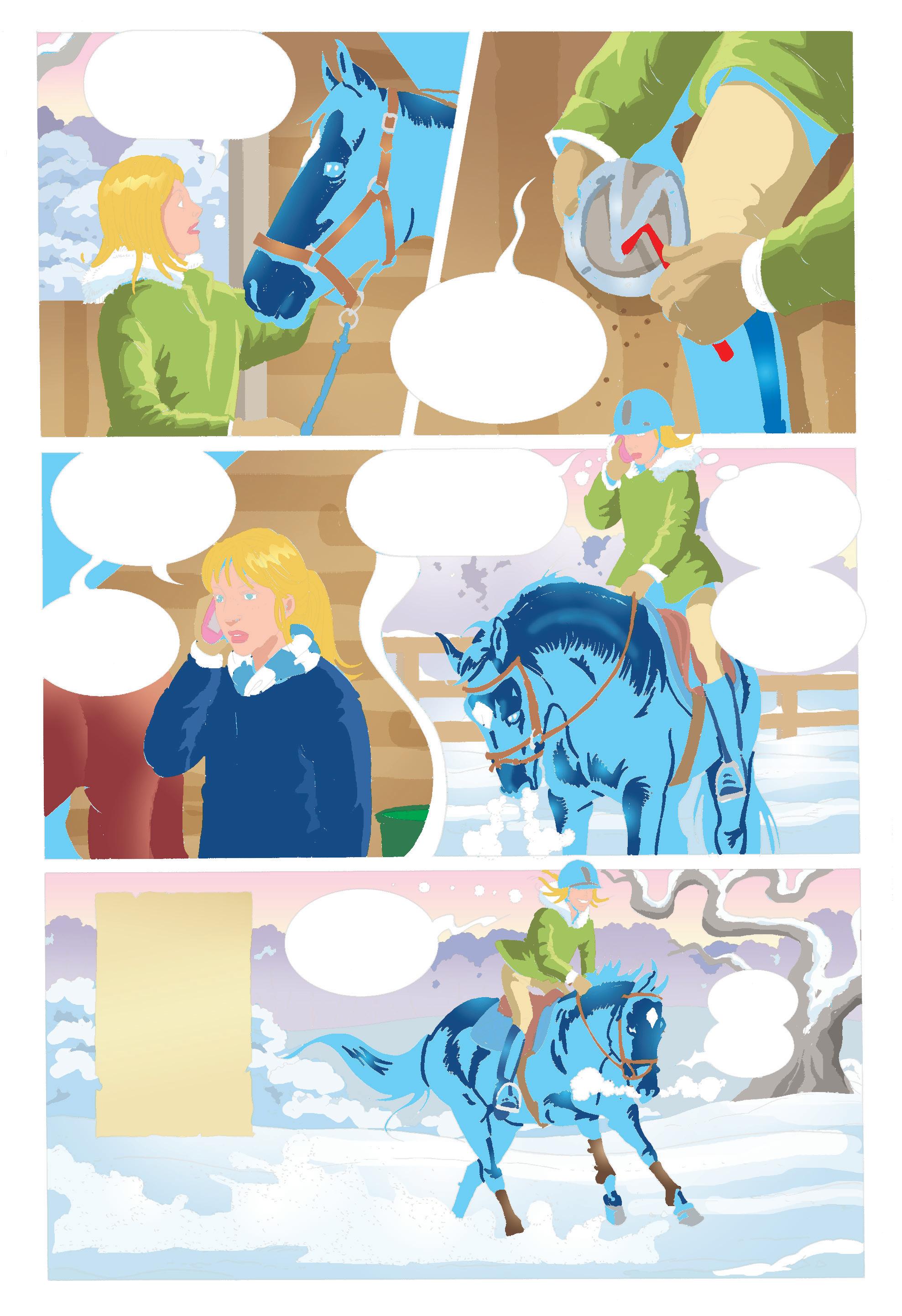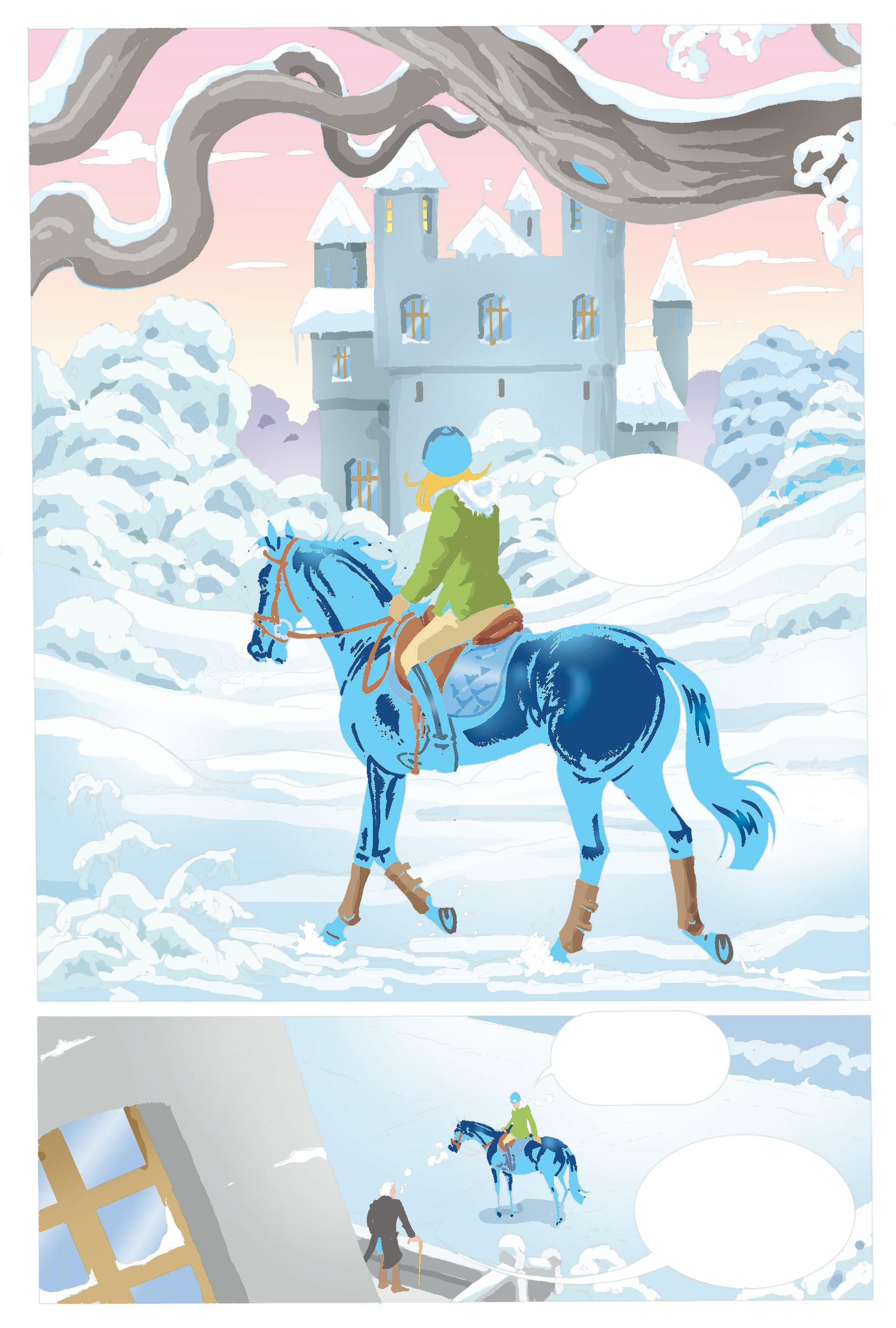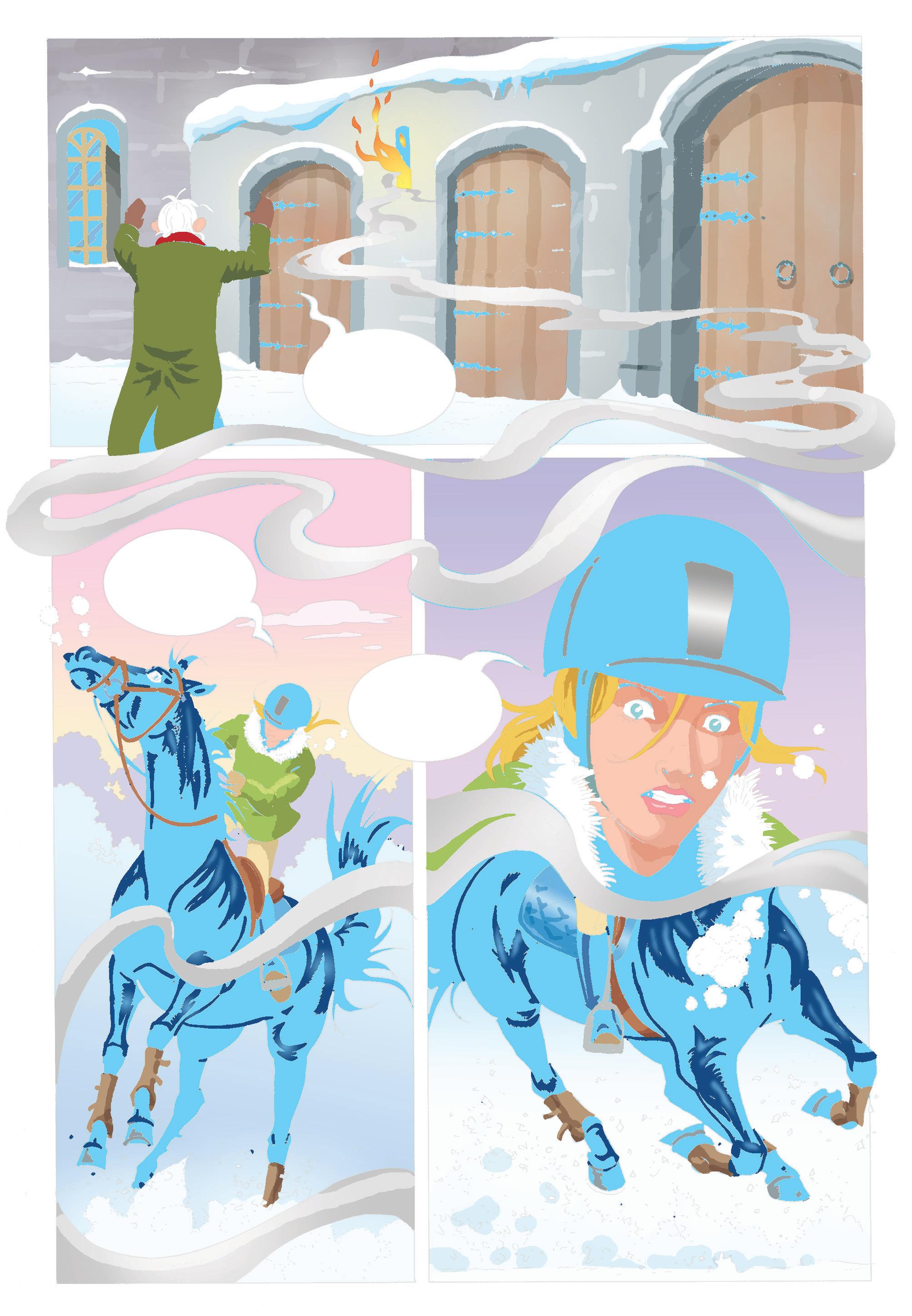 SNÖN PÅ FARFARS RIDBANA VAR DECIMETERDJUP, MEN LÄTT SOM PUDER. DEN VIRVLADE LIKT KRISTALLER KRING CILLA BLACKS HOVAR.