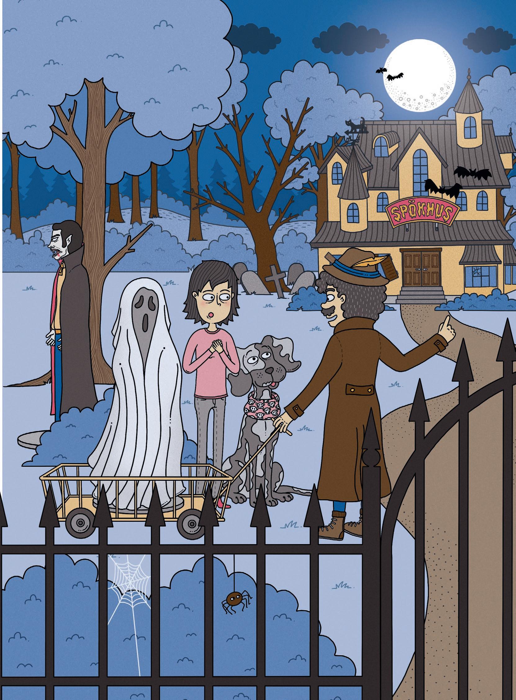 Då kommer en man med en vagn. På vagnen står ett spöke!