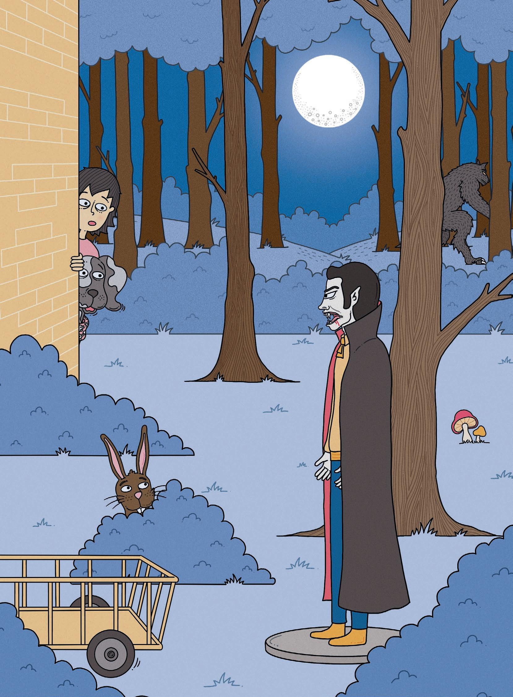 Det är kväll och Bodil ser en läskig film om varulvar. Men Tofu vill inte se film, han vill gå ut.