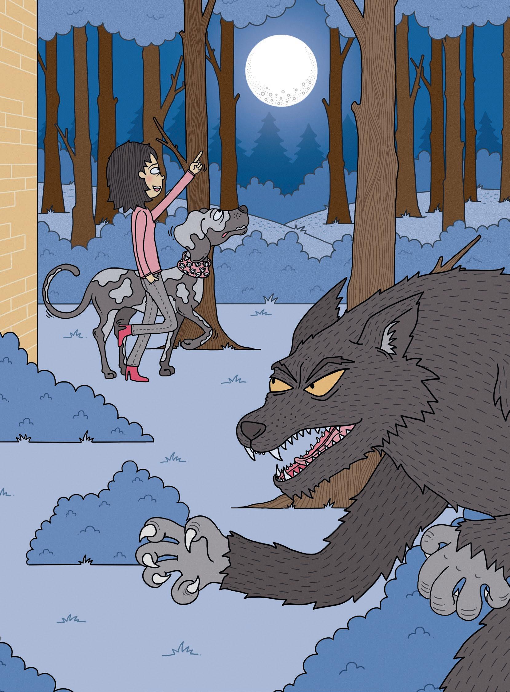 Ute lyser fullmånen. Då brukar varulvar visa sig. Fast de finns väl inte på riktigt ... eller? Bodil stannar tvärt. Är det inte en varulv där borta? Hjälp!