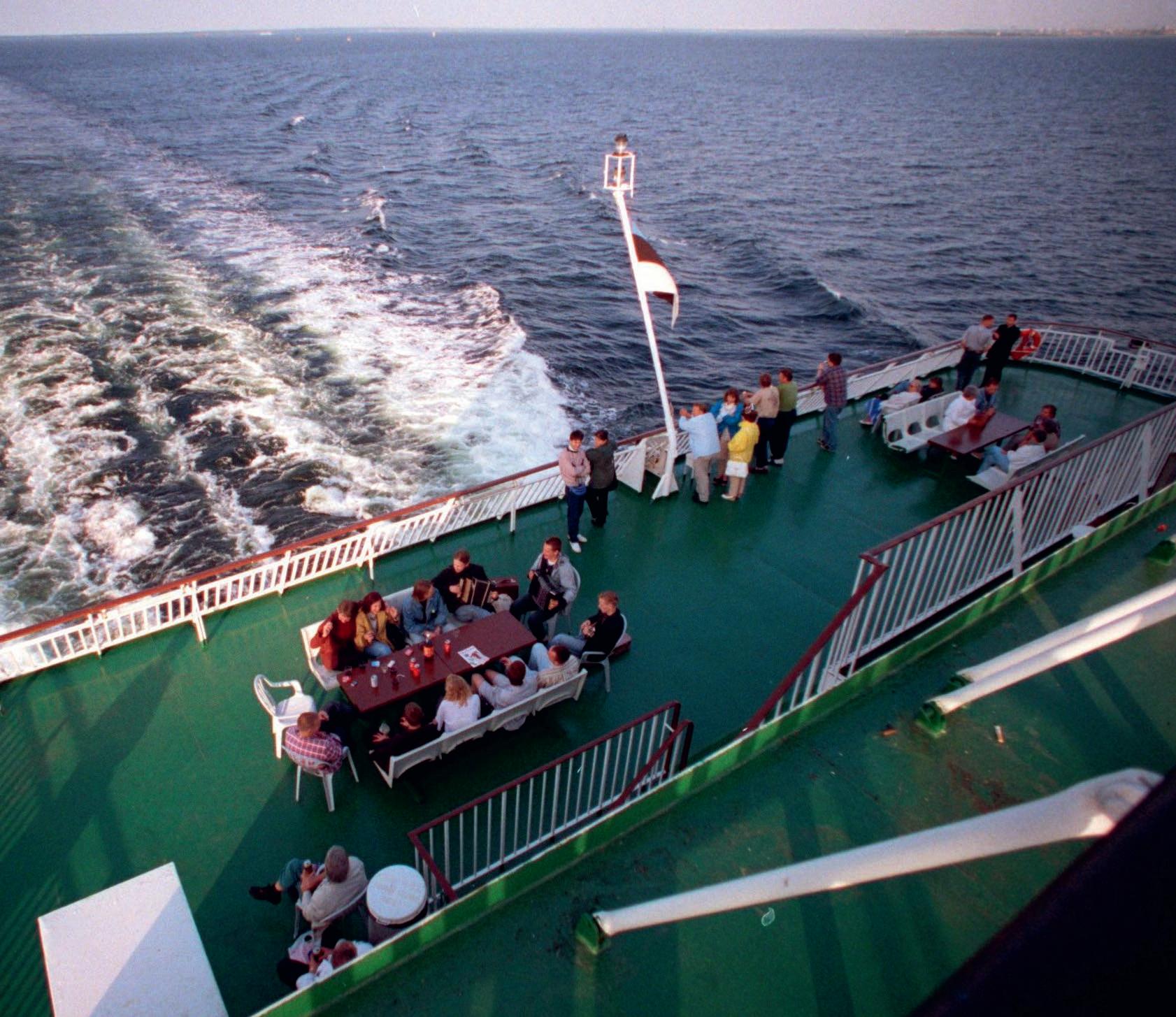 Passagerare sitter utomhus på Estonia i augusti 1994. Det var en månad före olyckan.