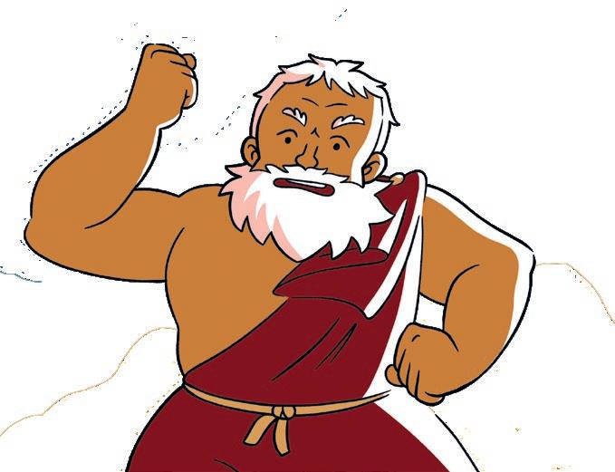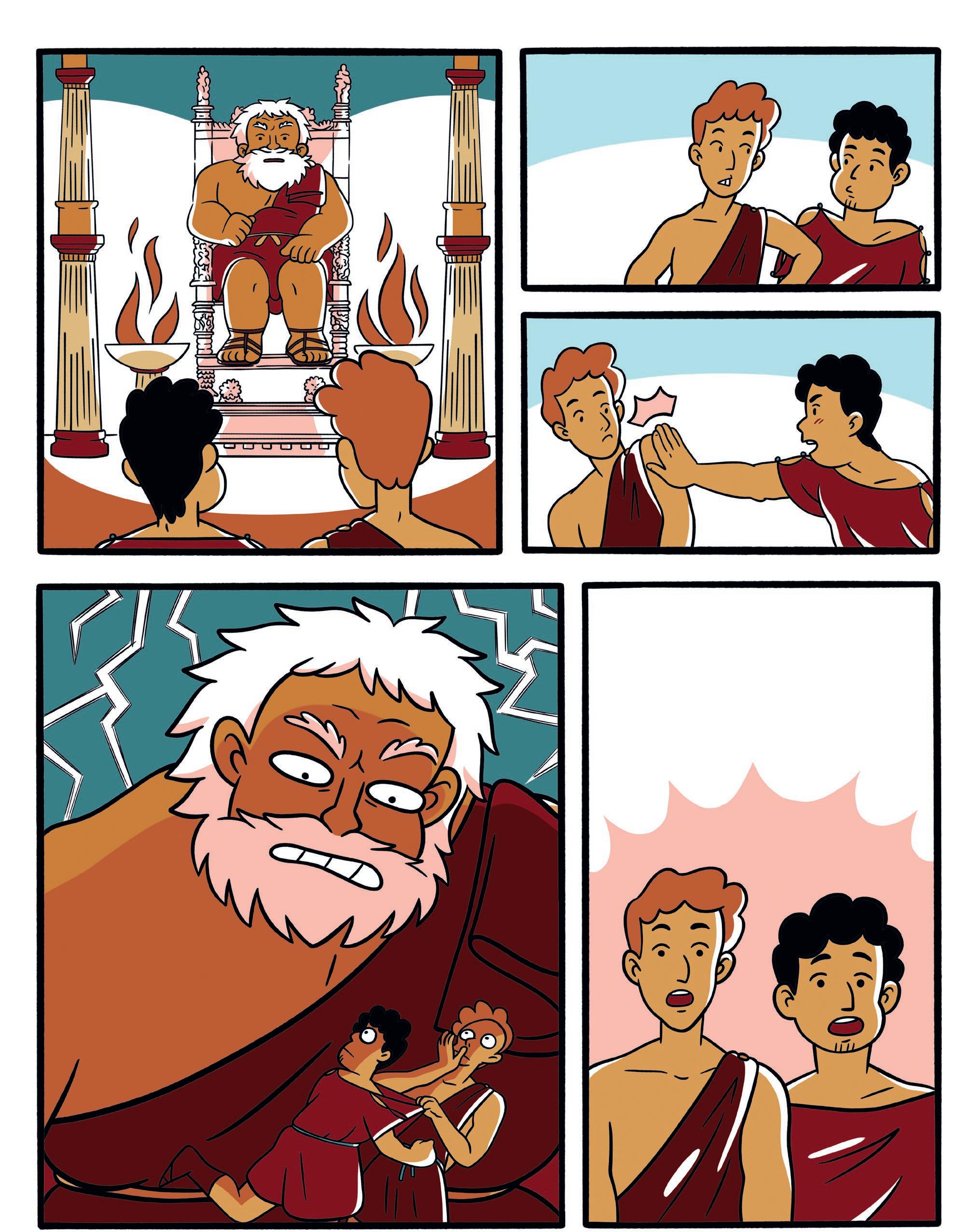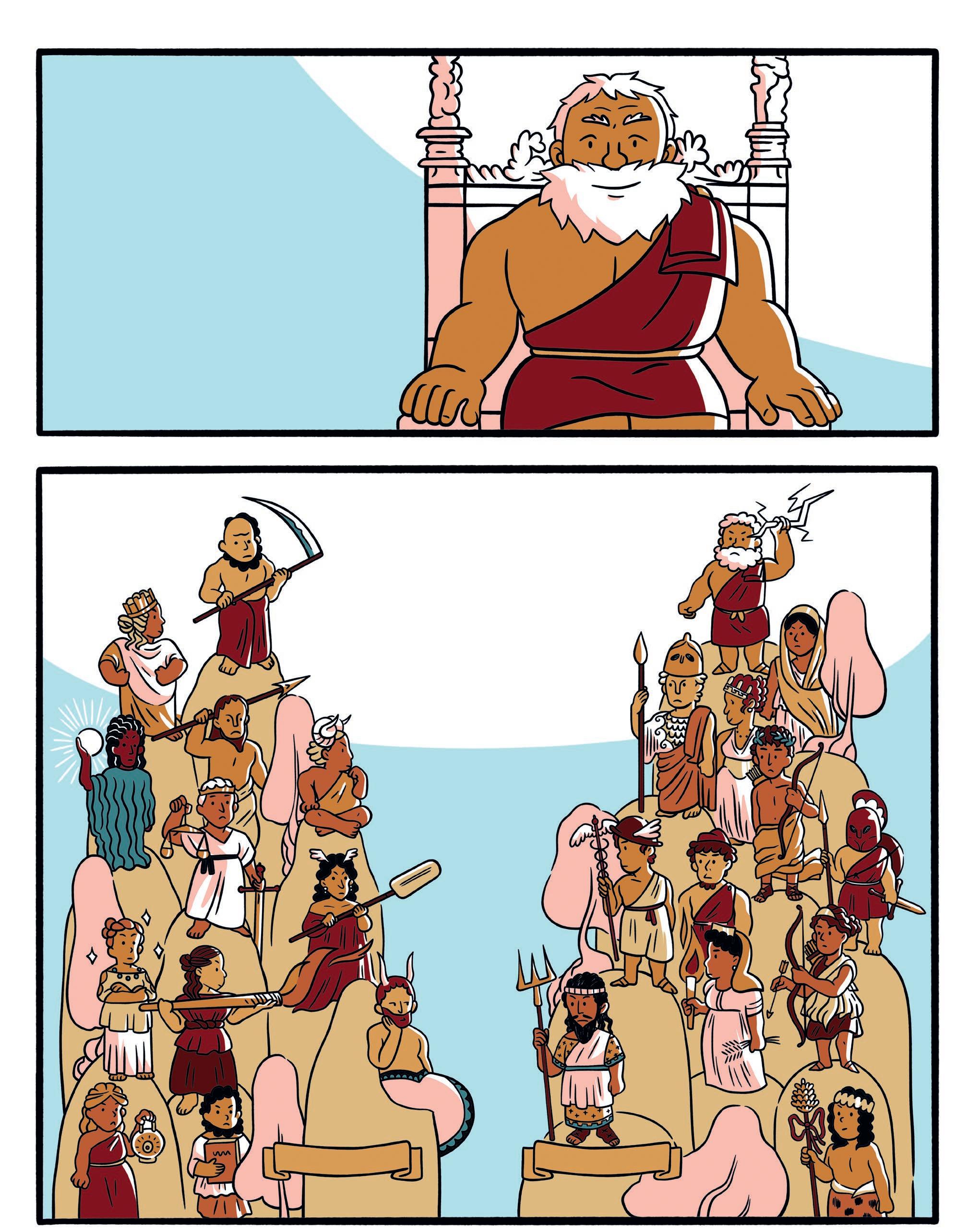 Min pappa, Zeus, är också en gud. Han härskar över berget Olympus. Ett annat berg men samma bråk. Han var en av de nya gudarna.