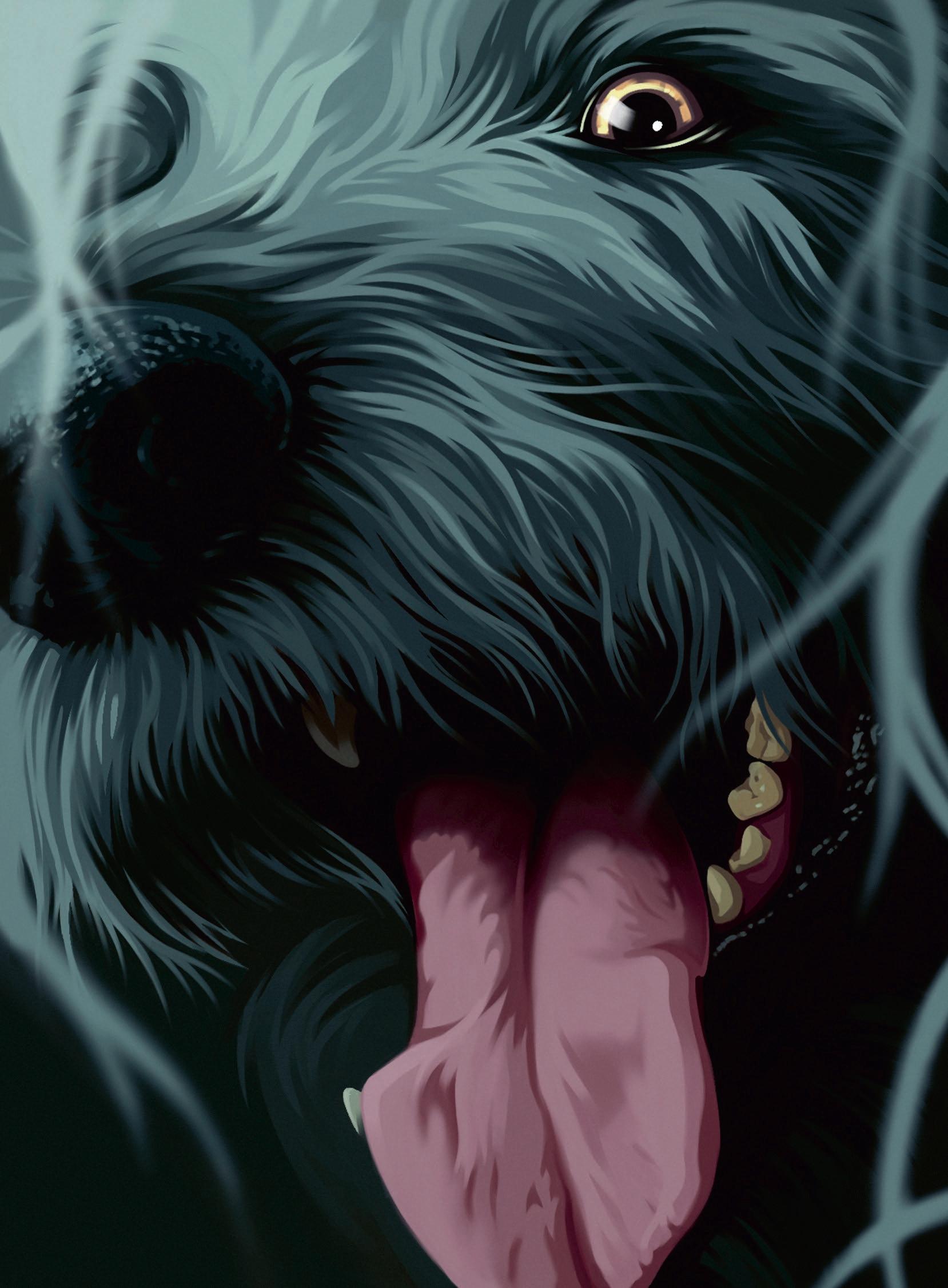 Nu gapade den stort och alla tänderna syntes. Tungan hängde ut genom munnen.