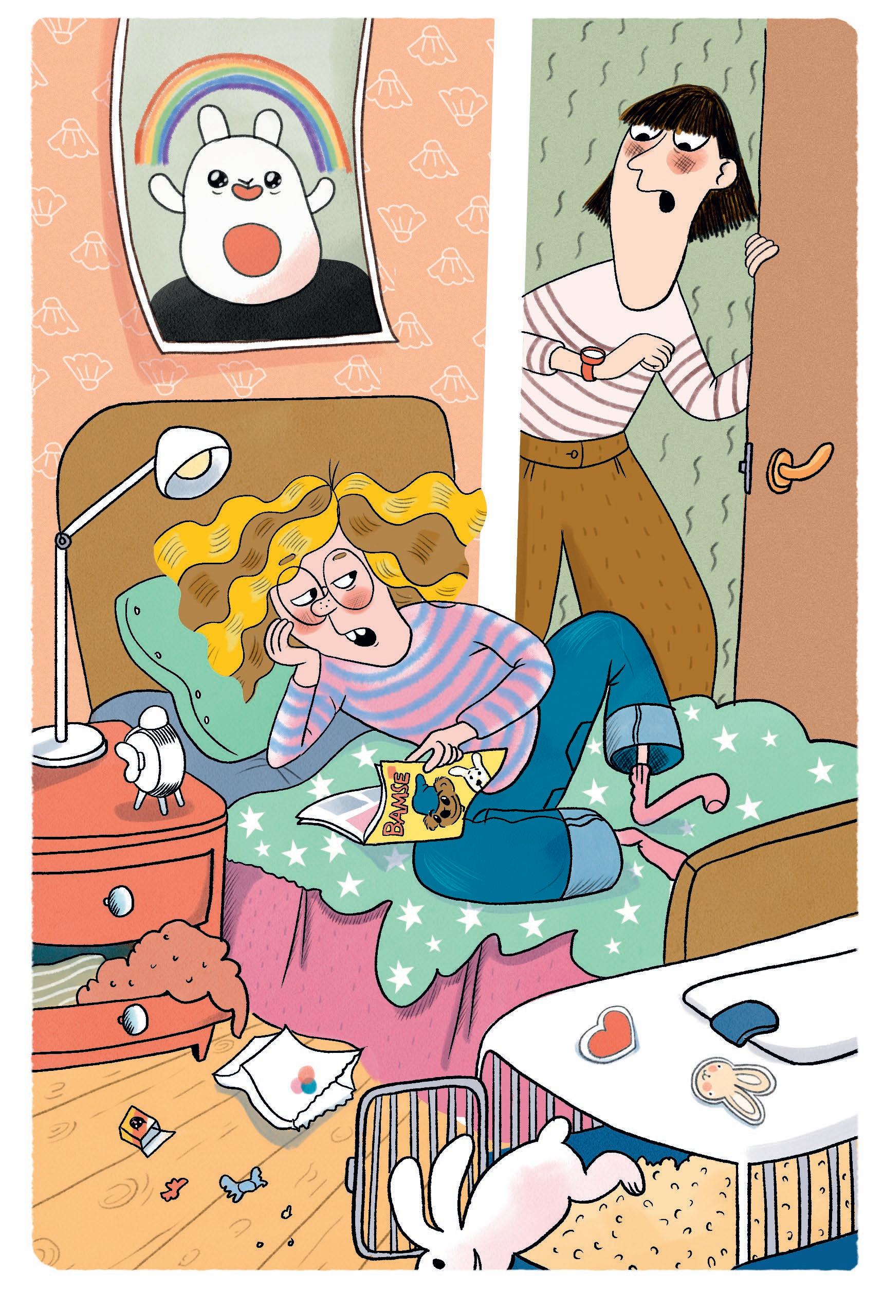 Hon ligger i sängen och läser en spännande serietidning. Hon har ingen lust att bli störd.