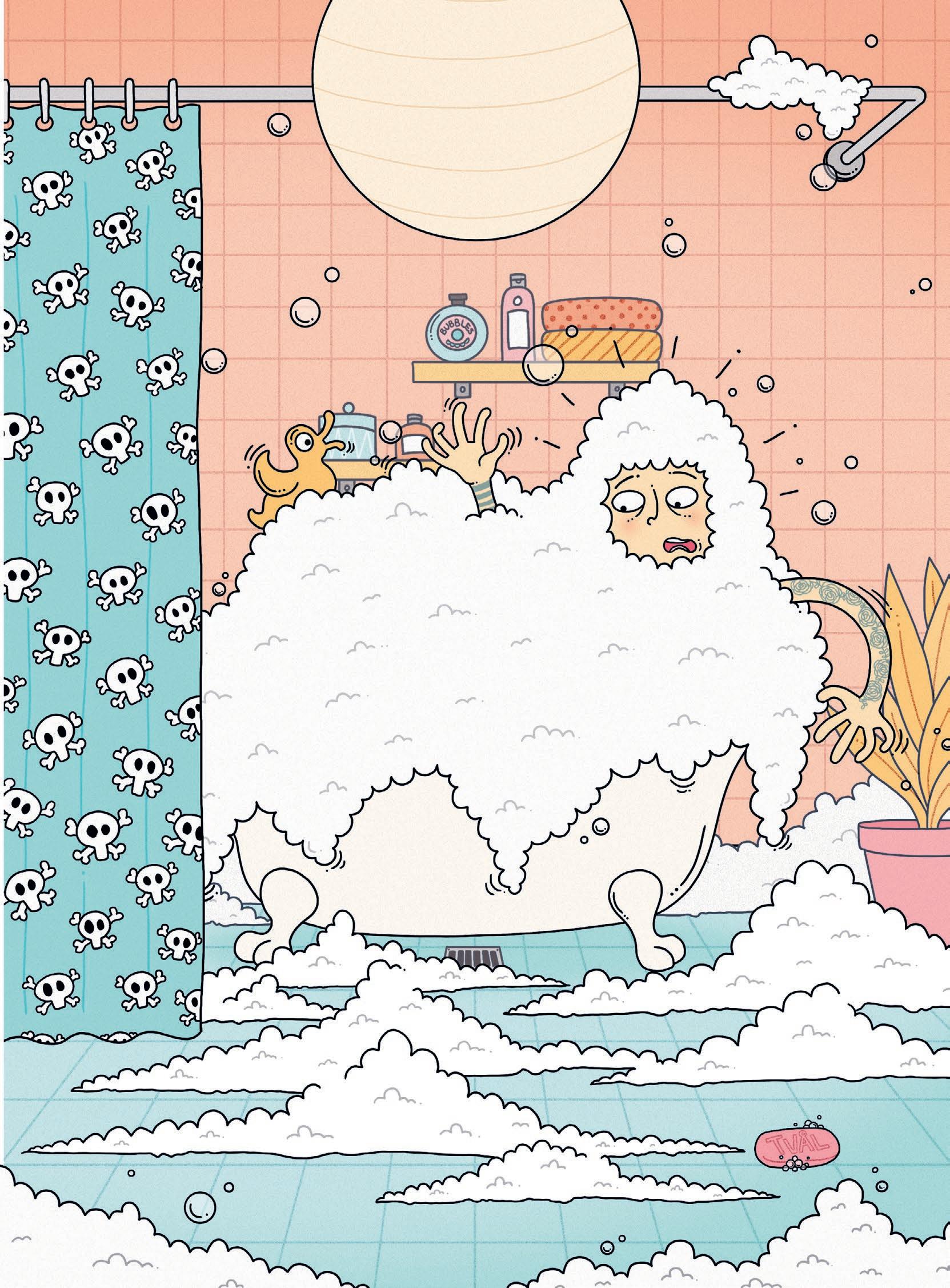 Så lägger hon sig i badet. Men hon råkar välta flaskan med badskum.