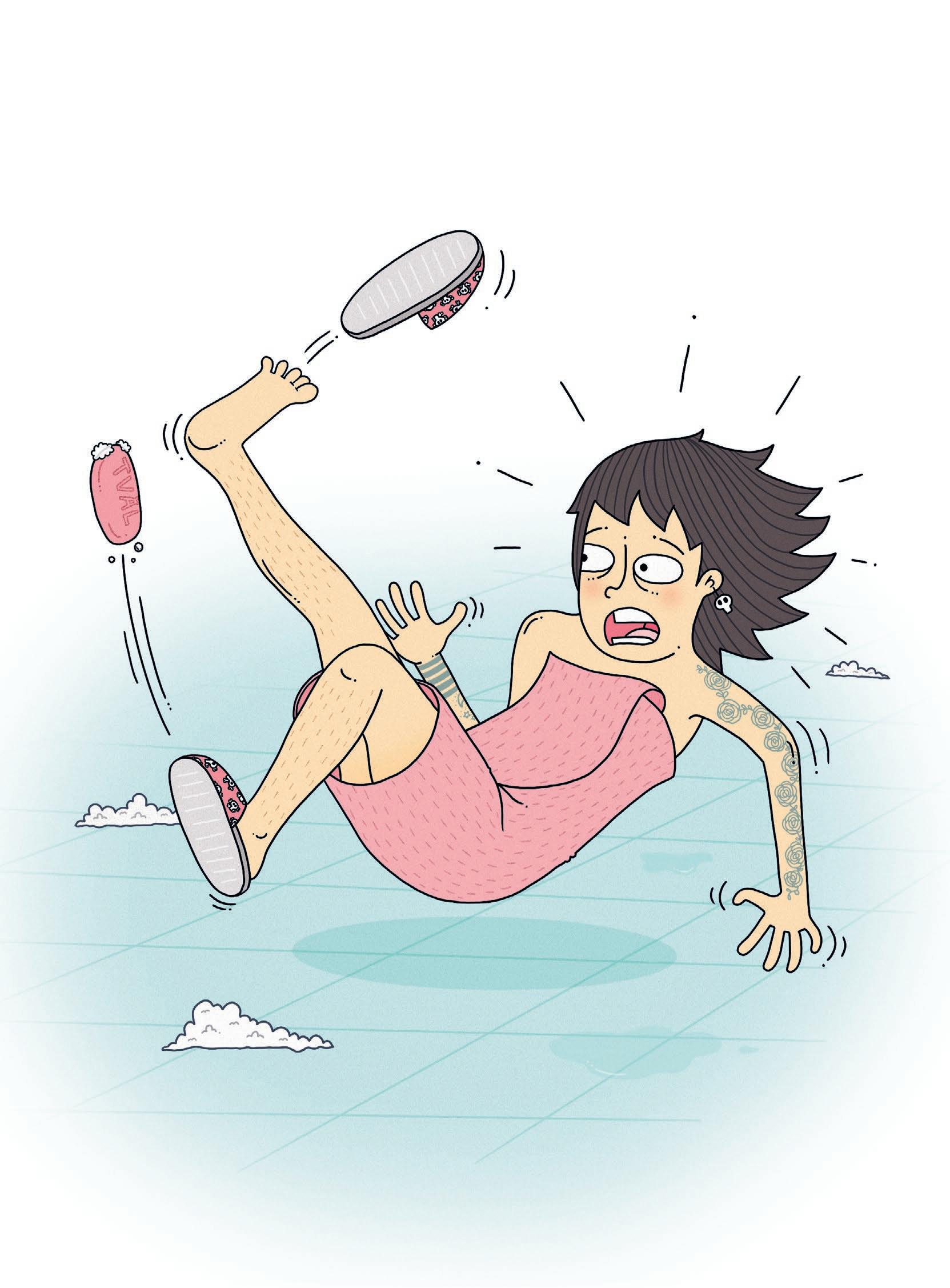 På väg tillbaka halkar hon på en tvål. Aj!