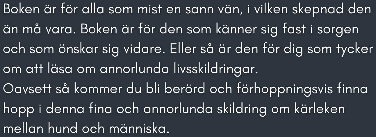 Så hurkan mansakna en hund så mycket?Varförsaknarjag hennesåmycket? Jagvet inte riktigtvar jagska börja. Bara detatt honläste migsom ingenannan gör, älskademig som jagknappt tror är möjligt. Honförstod inte nödvändigtvis människorsspråk,men honförstod minsjäls språk. Inte vad jagsäger iord utan vadjag egentligen menar. Somatt jagär trött, ledsen,sårad,uttråkad, glad.Dedär känslornahar hon fångat in tydligareännågon annanvarelse.Allanyanser.