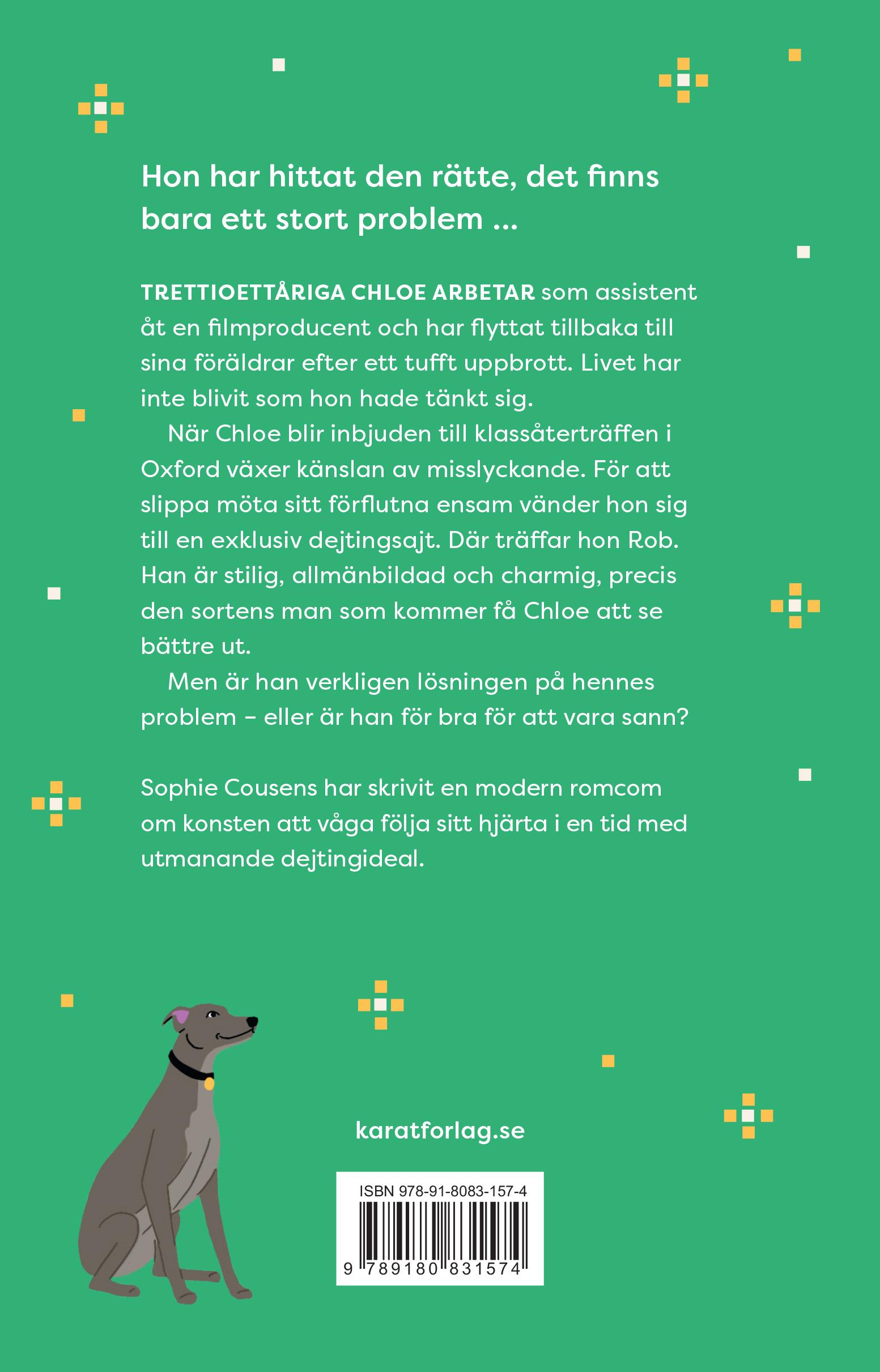 Av profilbilden att döma och de första trevande meddelandena som hade utväxlats verkade Tom … hoppingivande. Även om den gyllene regeln i dejtingvärlden var att aldrig hoppas på något. Det gällde att sänka sina förväntningar. Chloe kom alldeles för tidigt till puben och valde ett bord vid fönstret, på säkert avstånd från baren där tv:n dånade på hög volym. Det var Tom som hade valt stället. Hon skulle aldrig själv ha föreslagit den här sortens mötesplats där fotbollsmatchen var i full gång, heltäckningsmattan klibbade under skosulorna och inte en enda av de bargäster som drog nytta av happy hour-priserna såg det minsta glad ut.