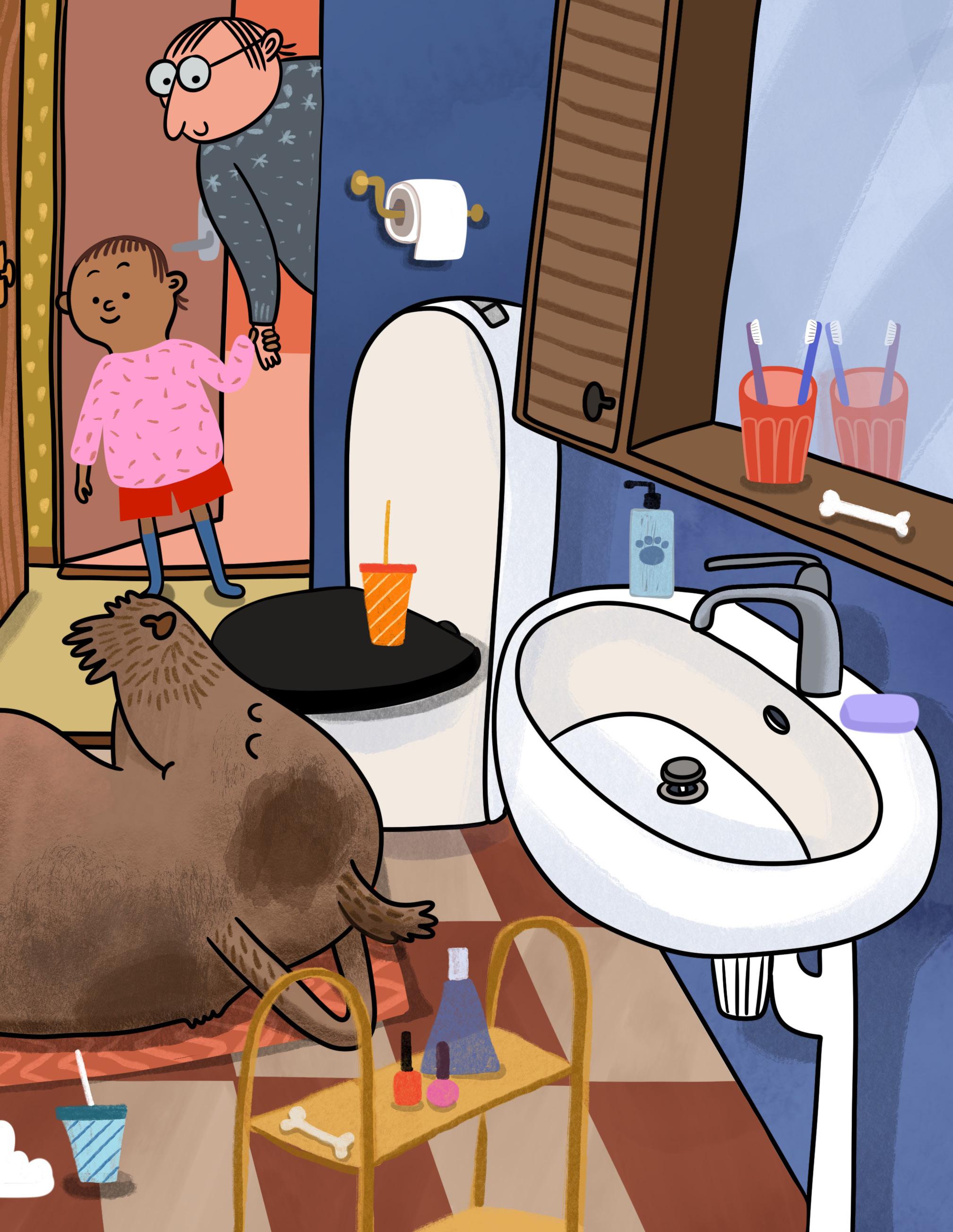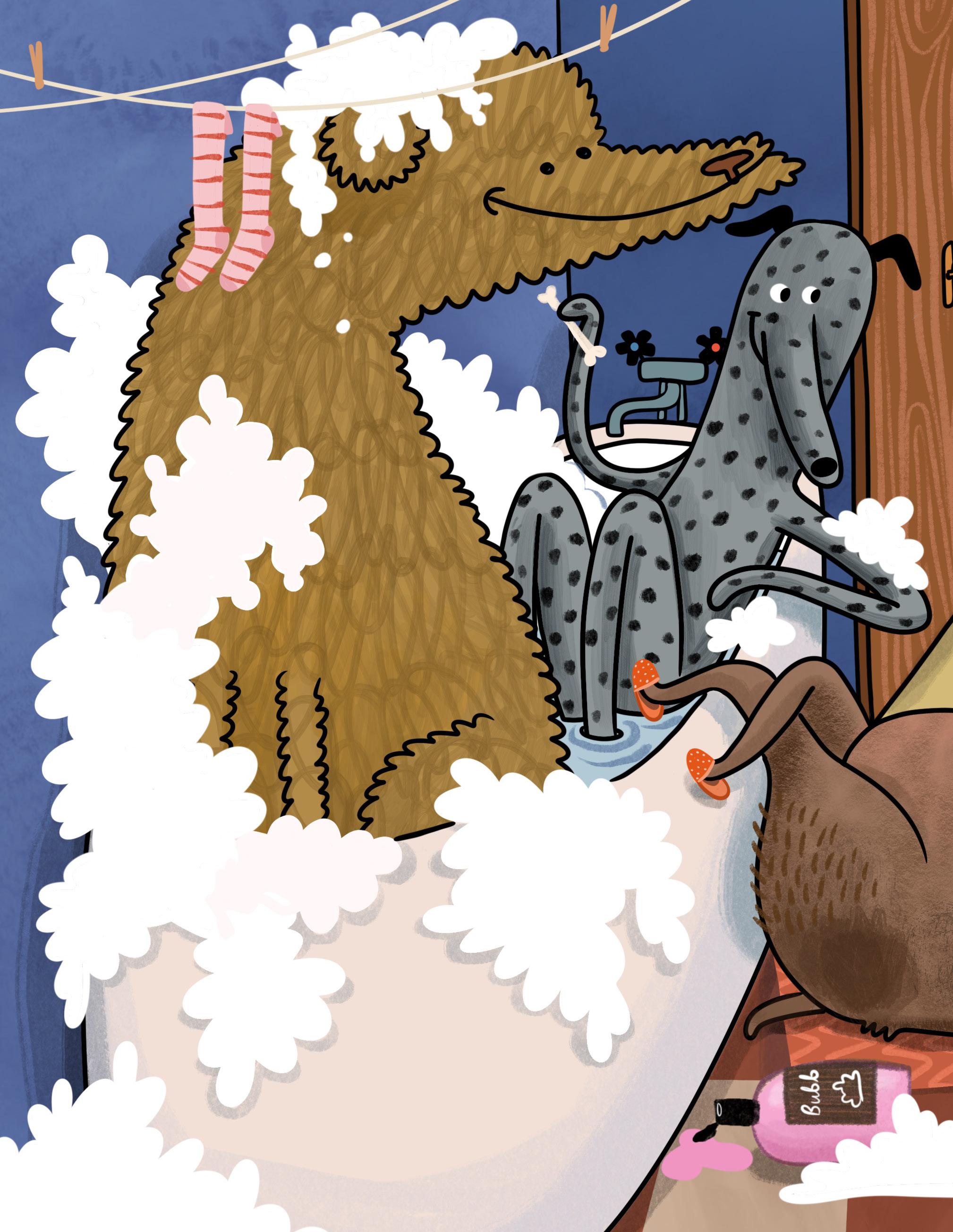 Bada badkar, mycket skum. Stora hundar, litet rum.