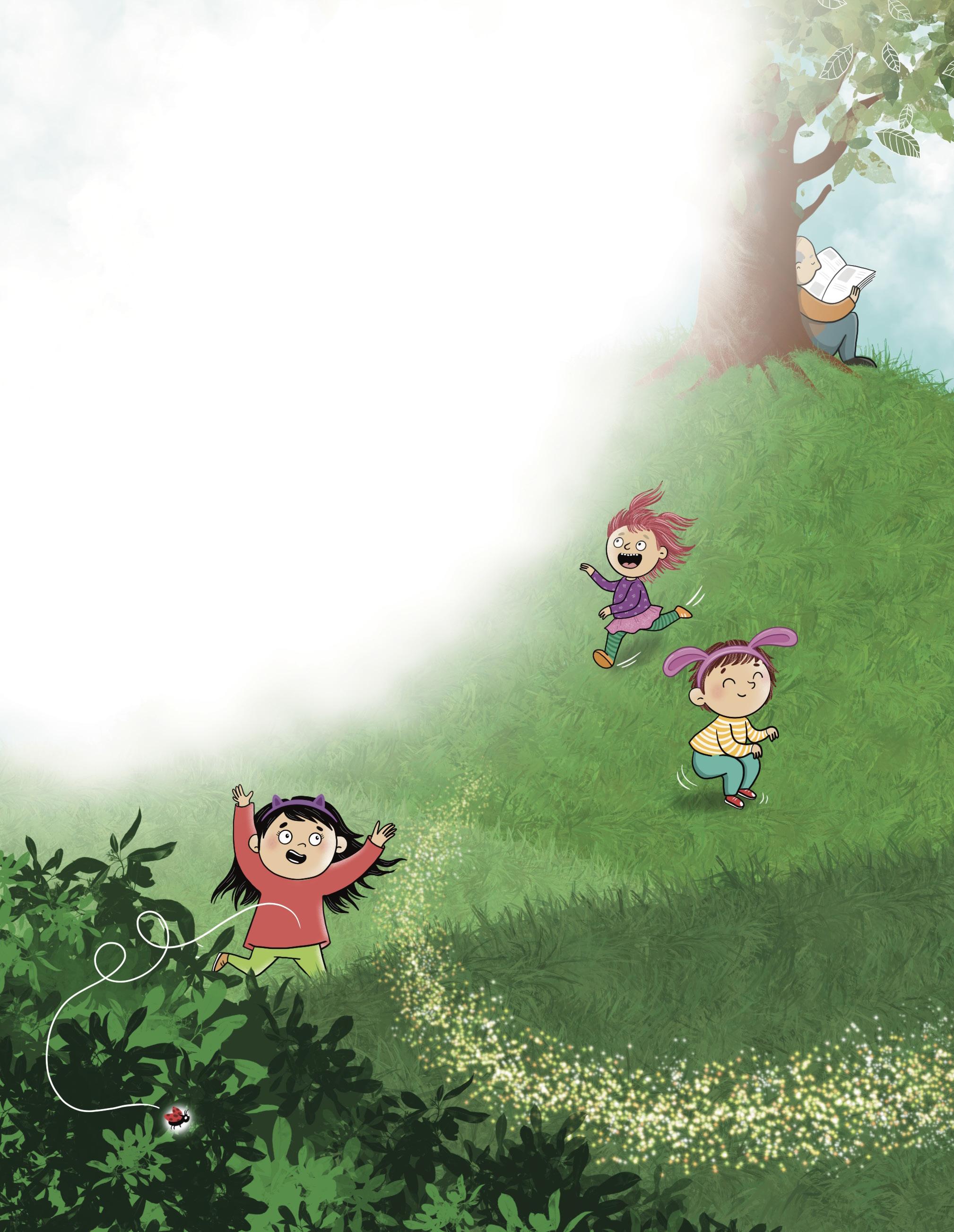 Kayla gjorde kullerbyttor och Leon skuttade som en kanin. Herr Pettersson satt och läste tidningen lutad mot trädet.