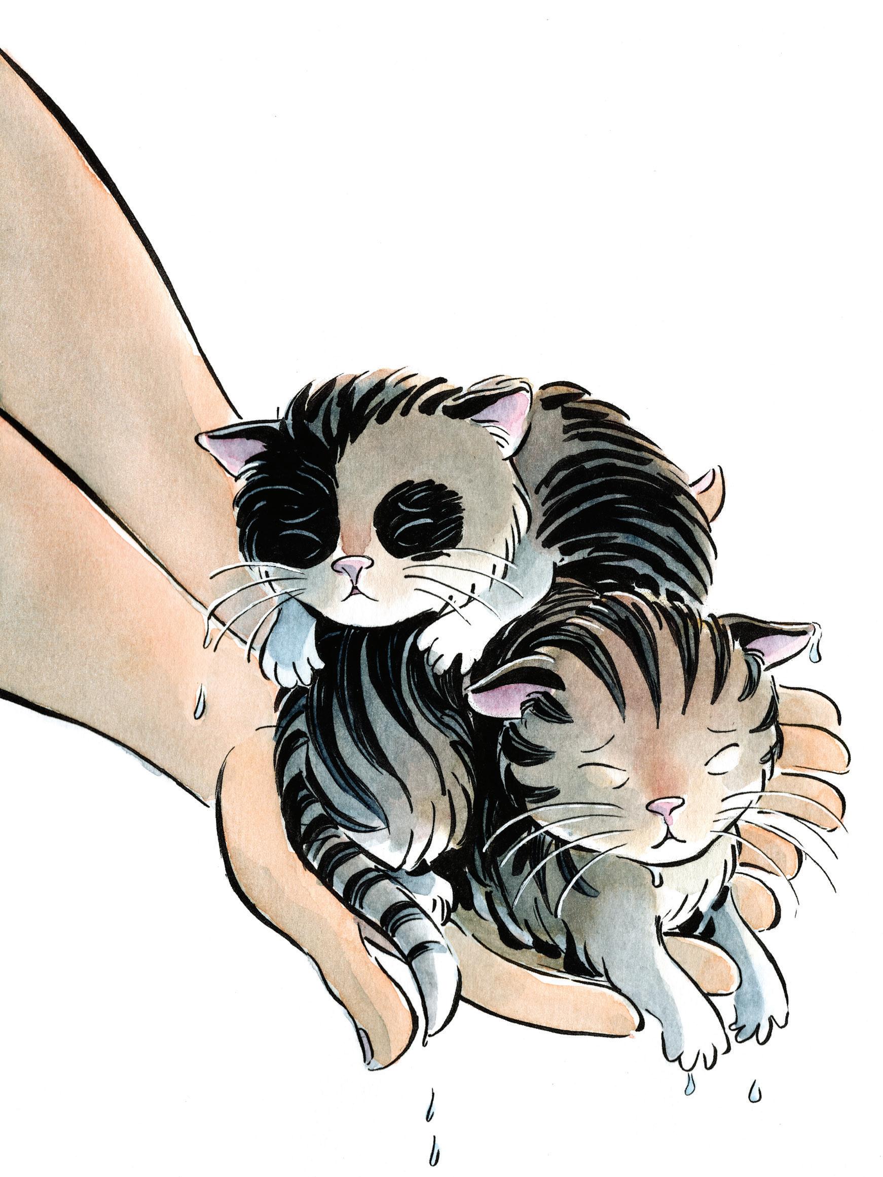den första lilla kattungen. När den piper högt stryker han den försiktigt över ryggen igen och pratar lugnande med den. Han lämnar över den fläckiga kattungen till Jakob och sträcker sig efter den randiga kattungen. Med varsin kattunge i famnen beger sig killarna in mot byn.