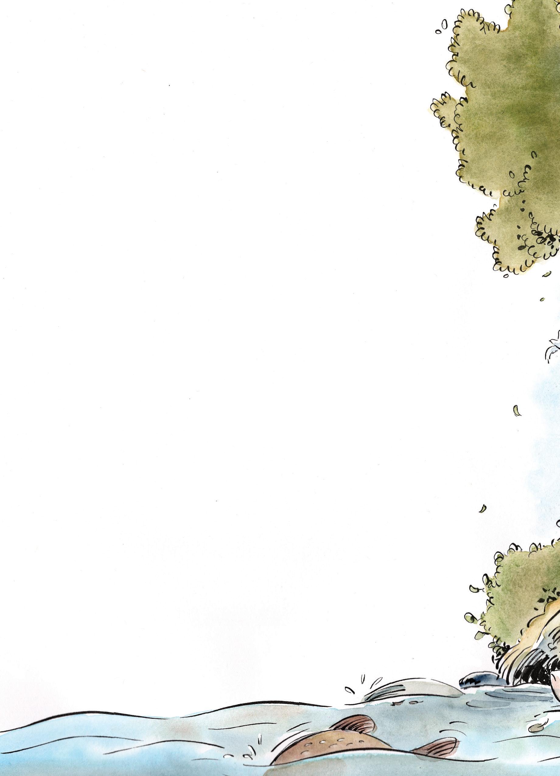 Han avbryter sig när Joakim flämtar till och skyndar sig närmare bäcken. Joakim stannar högst upp på slänten och skuggar ögonen med handen för att se bättre i solskenet.