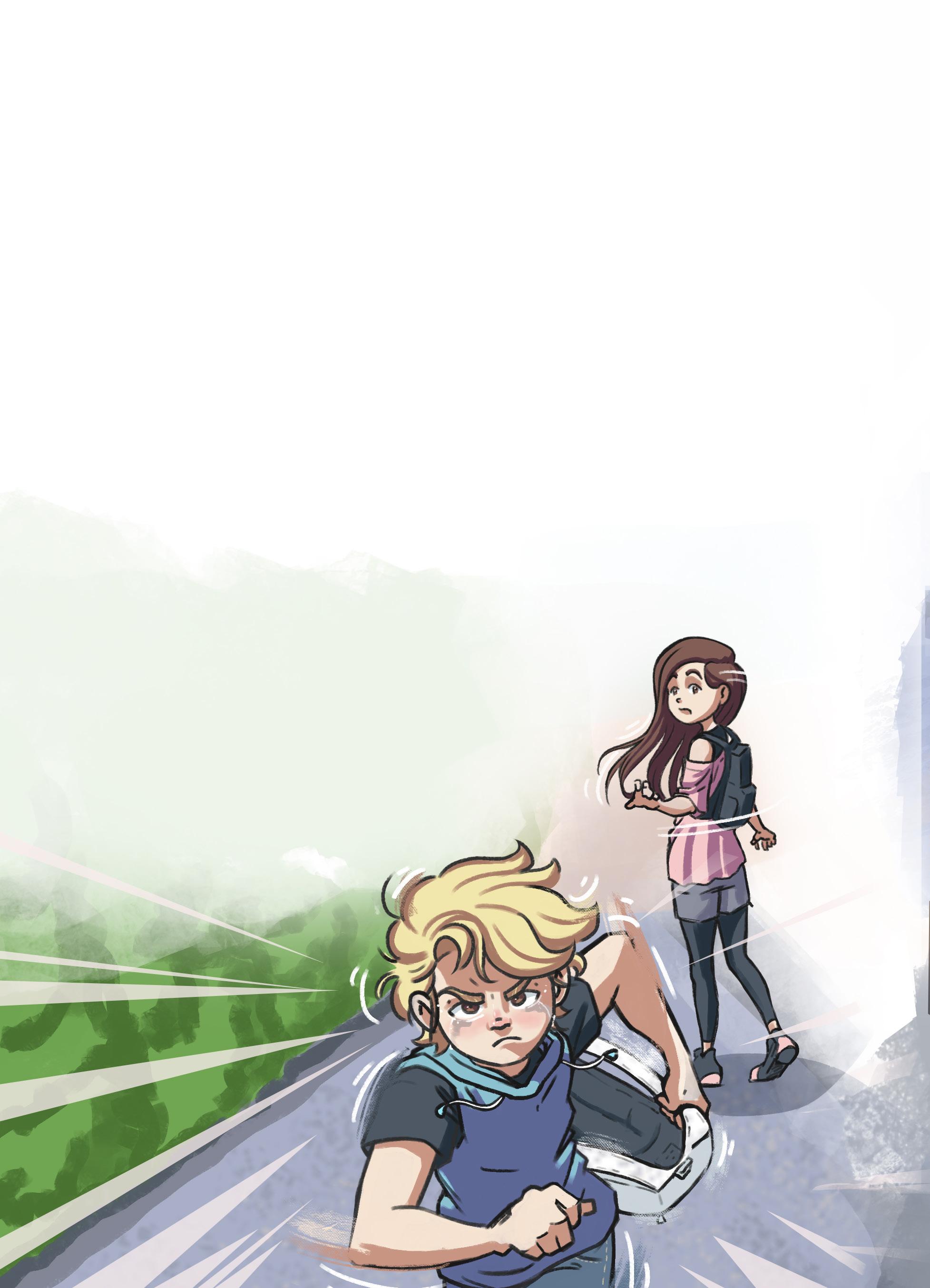 Oliver springer iväg mot skolan. Mira står ensam kvar och tittar förvånat efter honom.