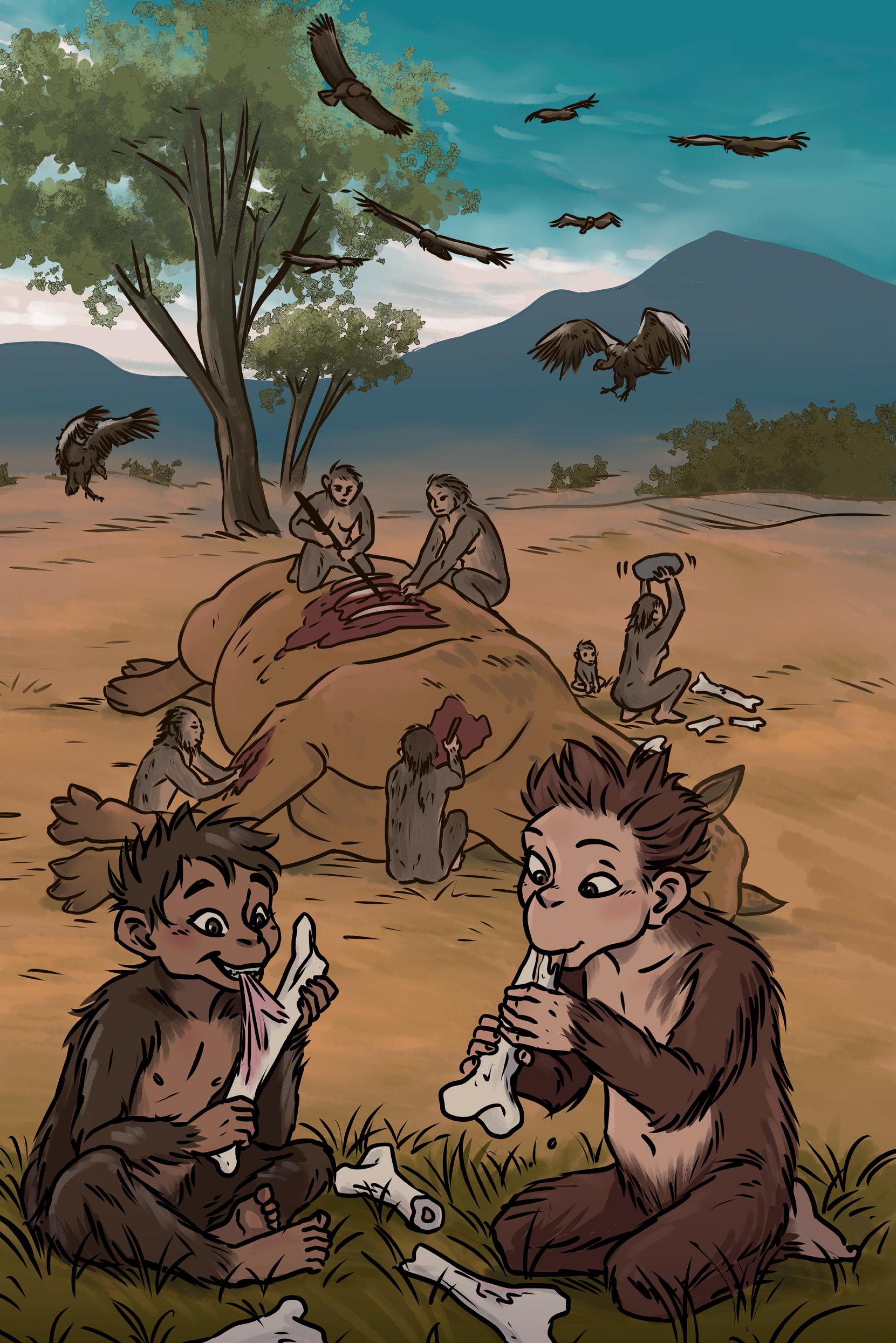 – Du har frågat helt rätt hominin! Jag är expert på mat! Men jag tror att jag behöver visa dig, säger han lurigt.