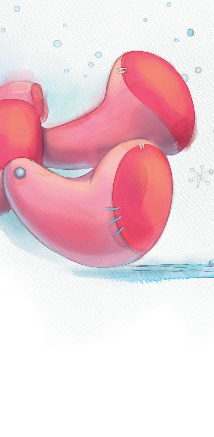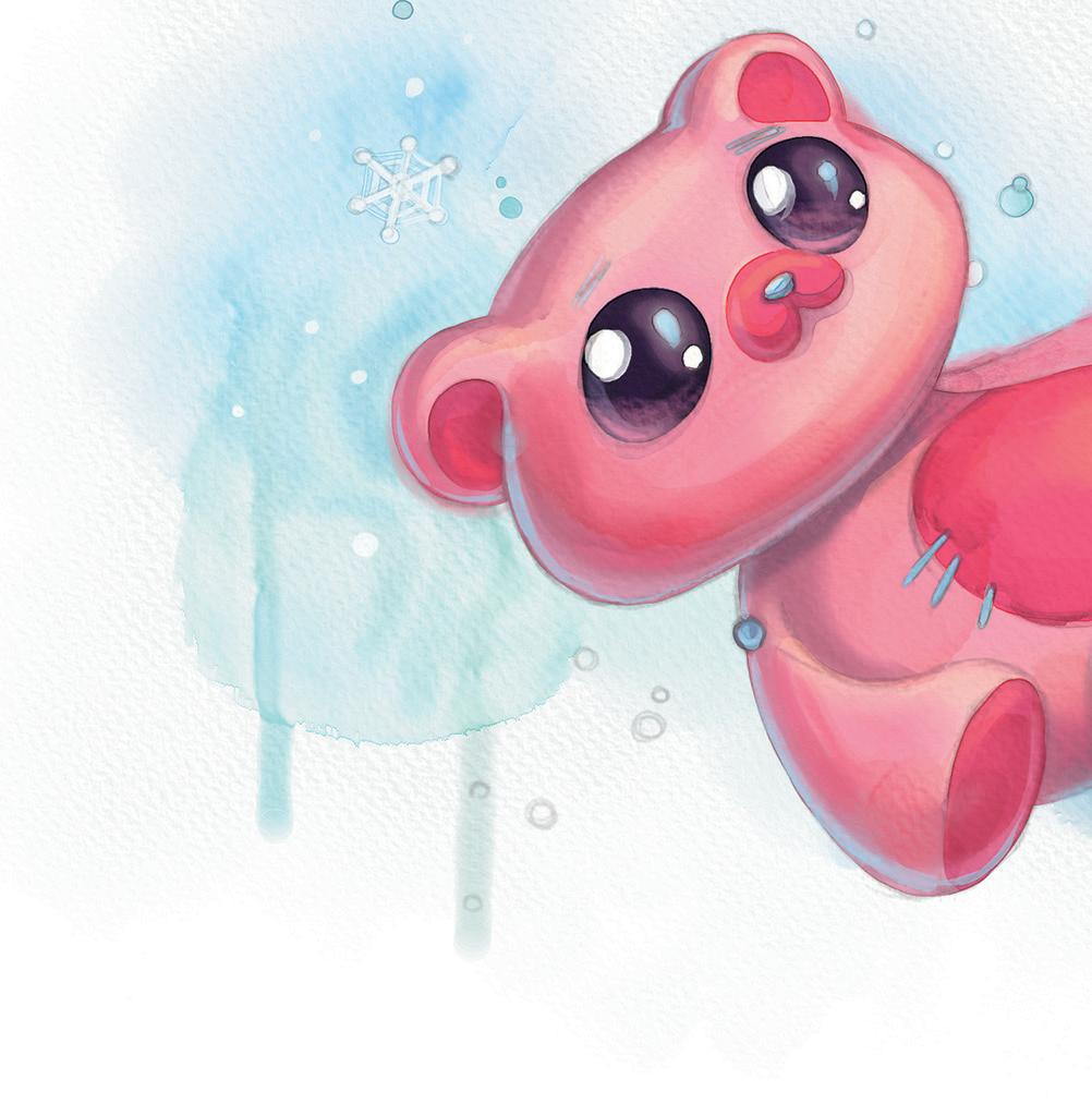 den i öronen och flyger lÄgt över marken bort till mamman. DÀr slÀpper de ner nallen sÄ att mamman kan se den.