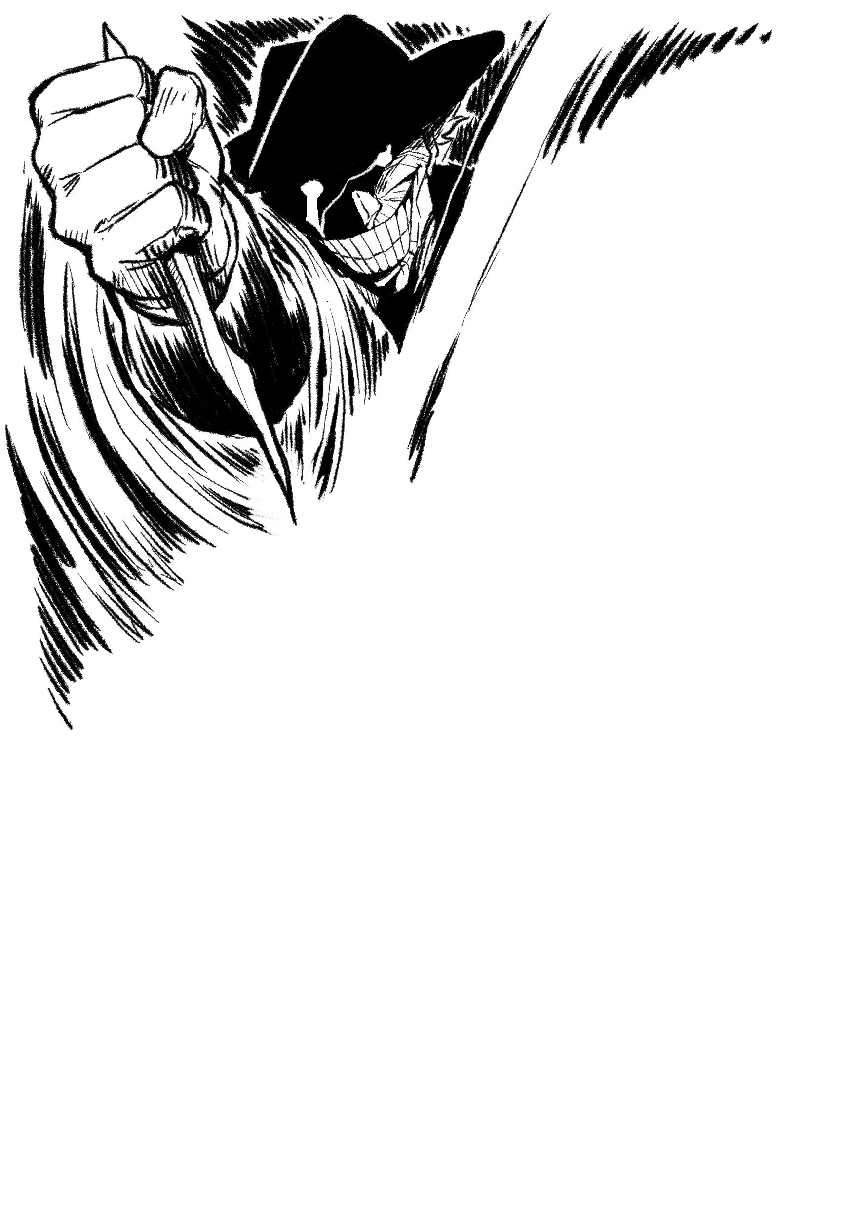 Det är en gammal man. Han är vithårig, mager och klädd i svart kostym. På huvudet har han en hatt och under den syns ett rynkigt ansikte. Ett stort ärr