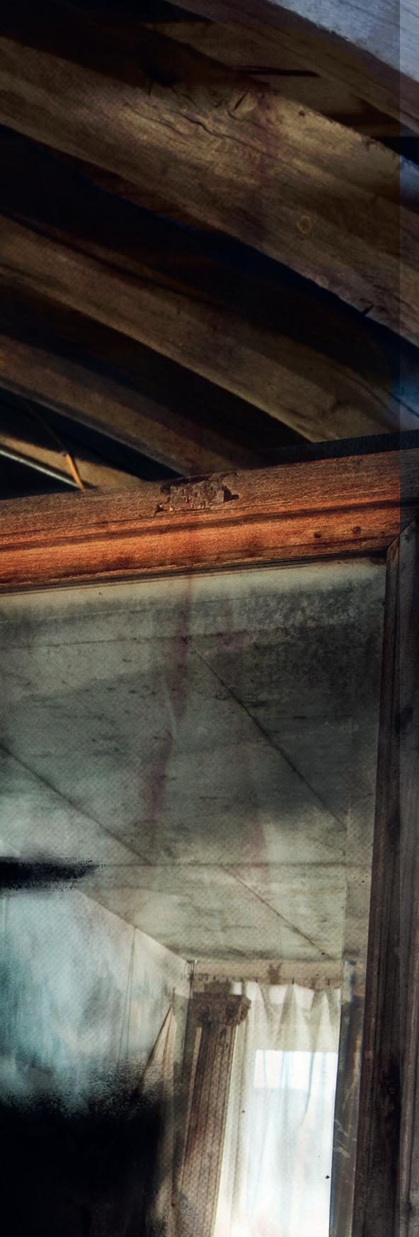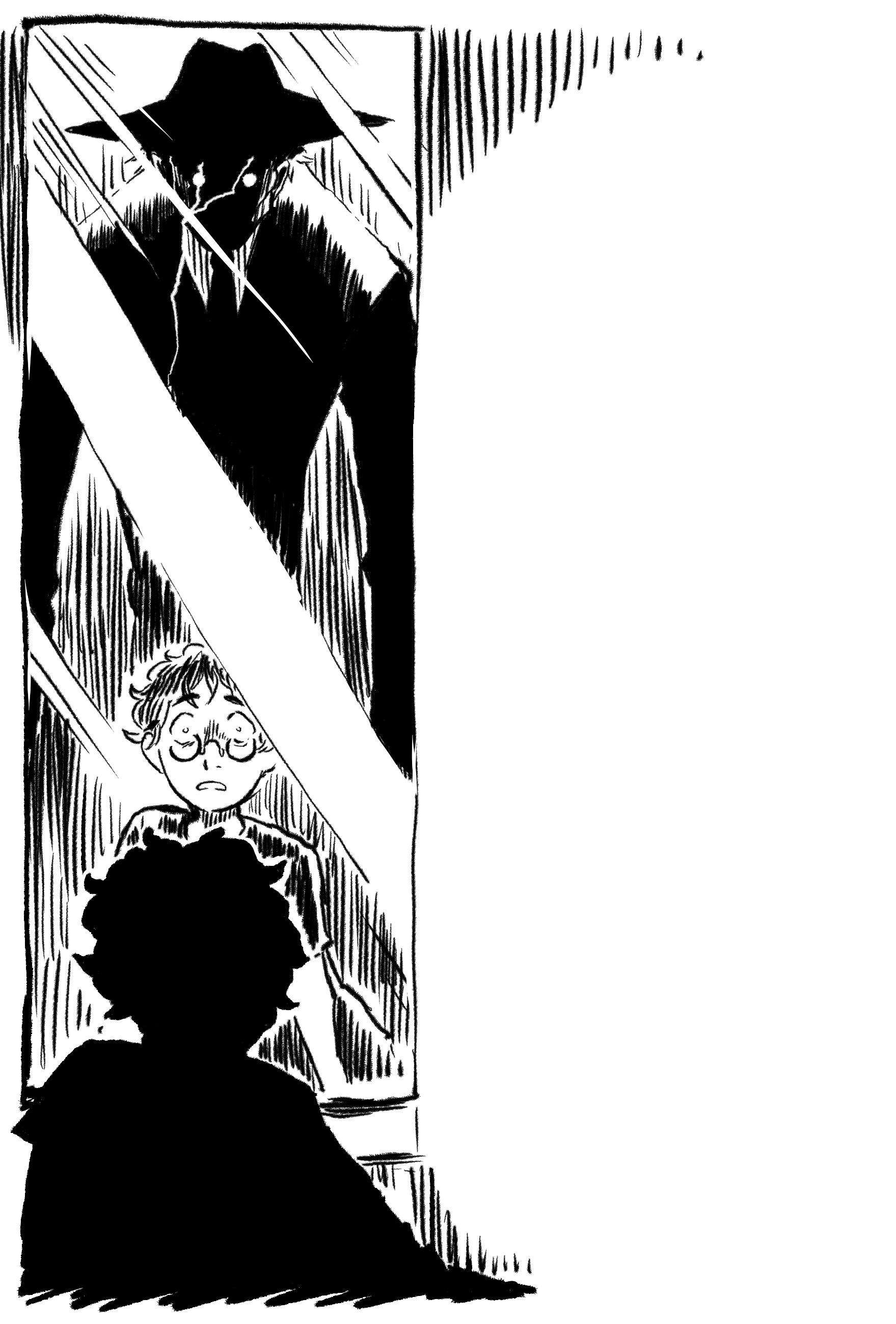 Ellie gråter. Hon hann precis hoppa undan när mannen i spegeln högg mot henne. Sedan rusade hon ut ur huset och ringde sin pappa. Nu står hon och pappa framför spegeln. Men där finns inte minsta spår kvar efter mannen.