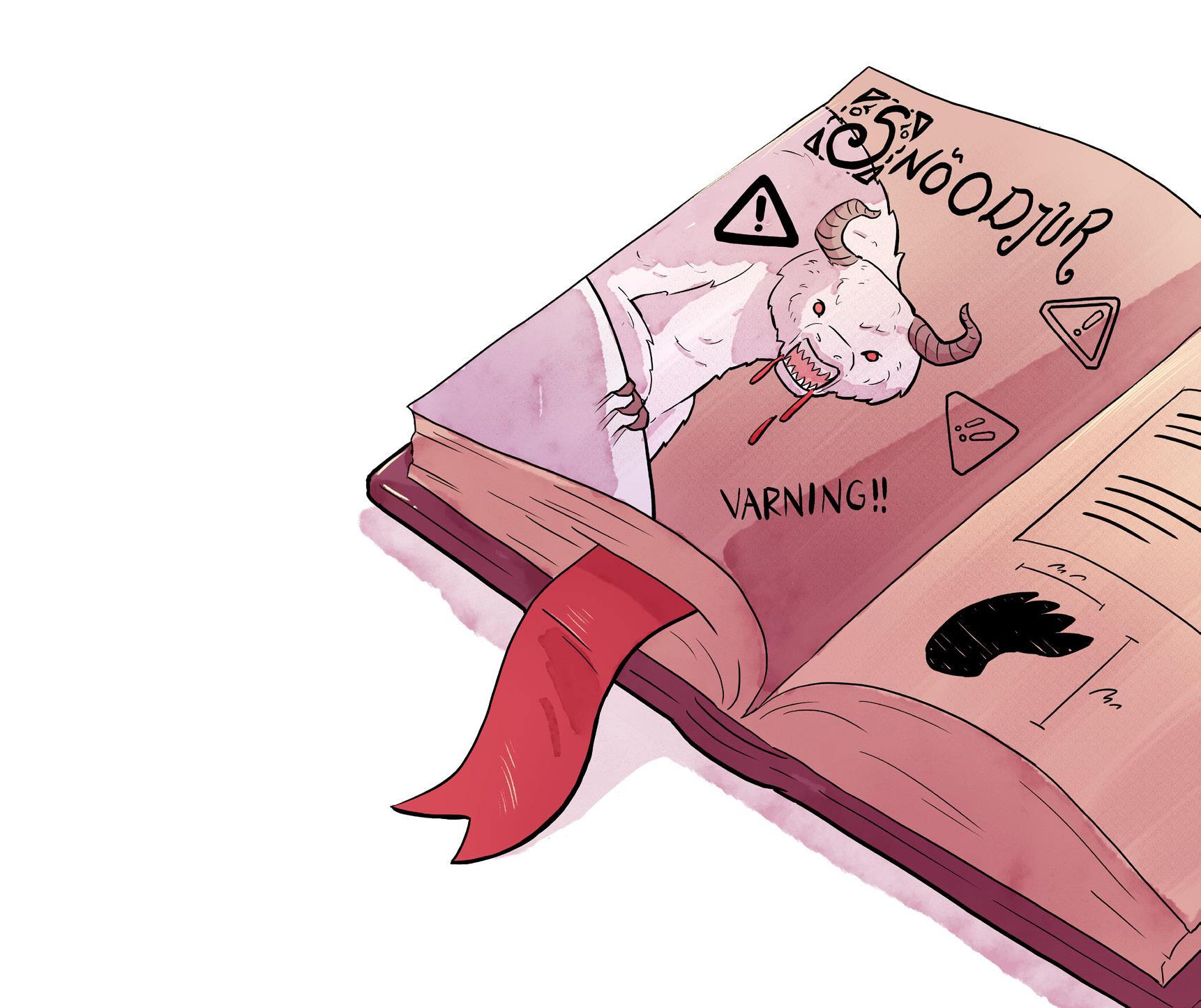 Vilma lutar sig över Viggos axel. Bilden på snöodjuret är så hemsk att de måste blunda med ena ögat för att våga titta på den. Det har långa, vassa klor och blodiga huggtänder. Viggo ryser och börjar läsa.