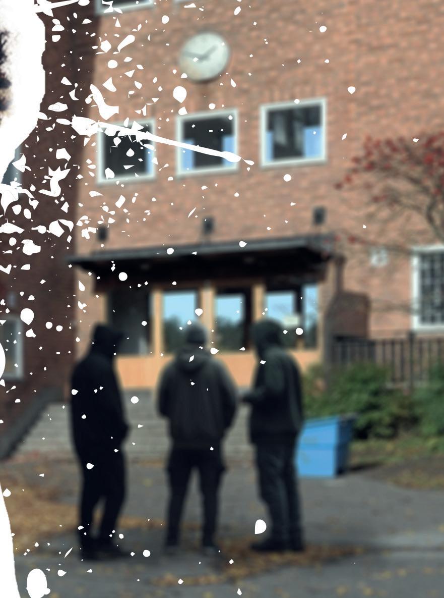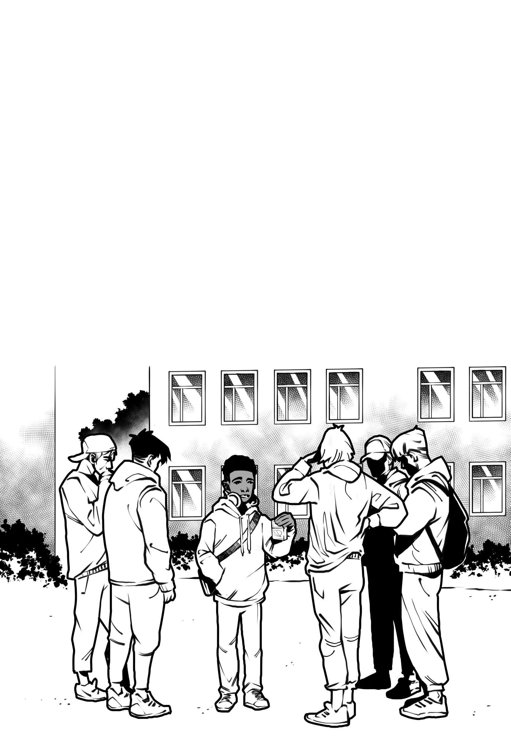 Han drar upp luvan. Volymen är hög i lurarna. Abbe och Ludvig går fem meter framför som vanligt. Inte för att vara taskiga. De har bara inte så mycket gemensamt att snacka om.