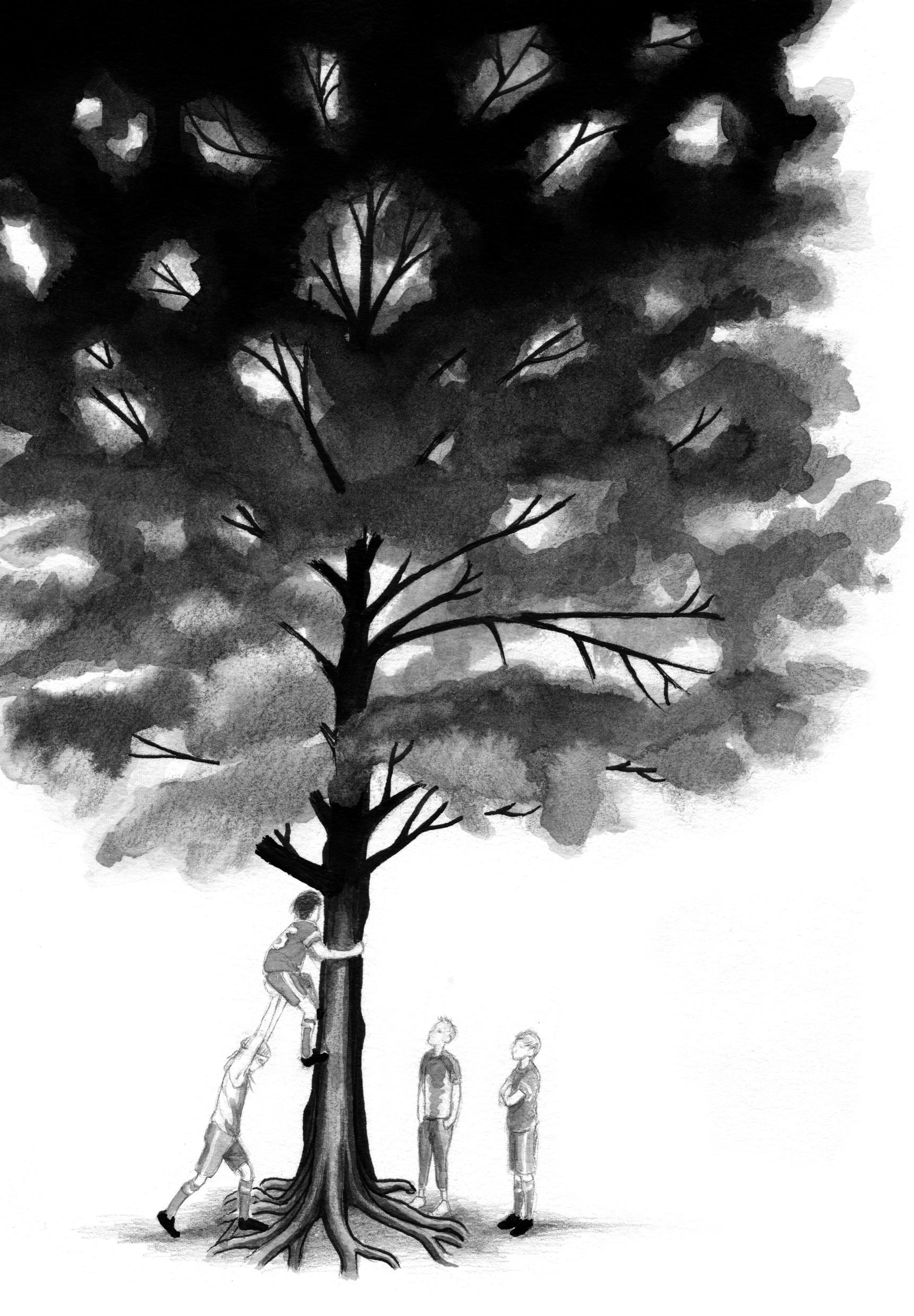 Viktor tvingar upp Timo i trädet.