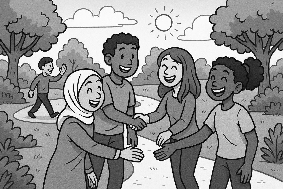 Iparkenfinns också olikagrupper av människor: några sitteroch fikar, andraspelar fotboll, vissa promenerar medhunden. Varjegrupp harsinaegnaoskrivna regler –som attman måstepassa bolleni fotbollsmatchen, elleratt manturas om vidgungorna. På sammasätt fungerardet isamhället: varjemiljö (skolan, arbetsplatsen, familjen, fritiden) harsinaegna normer ochförväntningar på hur vi ska bete oss.