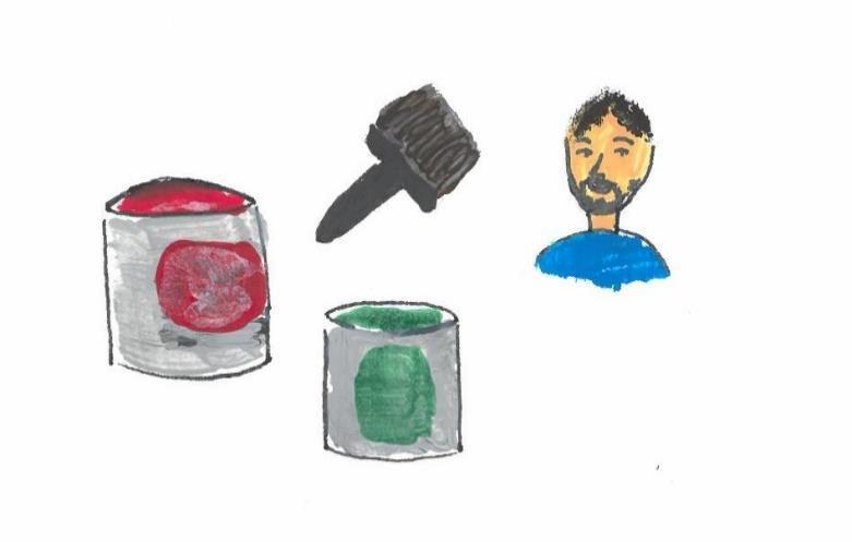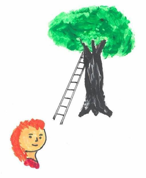 “Joodåå...” säger Målar-Lasse samtidigt somhan fundersamt kliarsig på hakan. “Visst skulleni kunnafålånastegen. Mennuärdet så attjag har tagit den till Mat-Stina,för jaghållerpåatt måla om hennes butik. Men detärklart, om ni hjälper migatt måla färdigt butiken så attdet gårlite fortare så kanjag hjälpaeratt få nerdet gula somfladdrari trädet efteråt.”