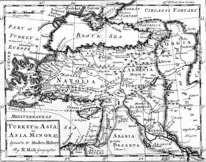 1739 mapofTurkeyinAsiaMinor by the18th centurygeographerHerman Moll, reference(1).Kurdistan (herecalled“Curdistan”)isshown to extend well beyond thewestborderofthe Ottomanempireand theZagros Mountain rangeinsidethe Persian empire