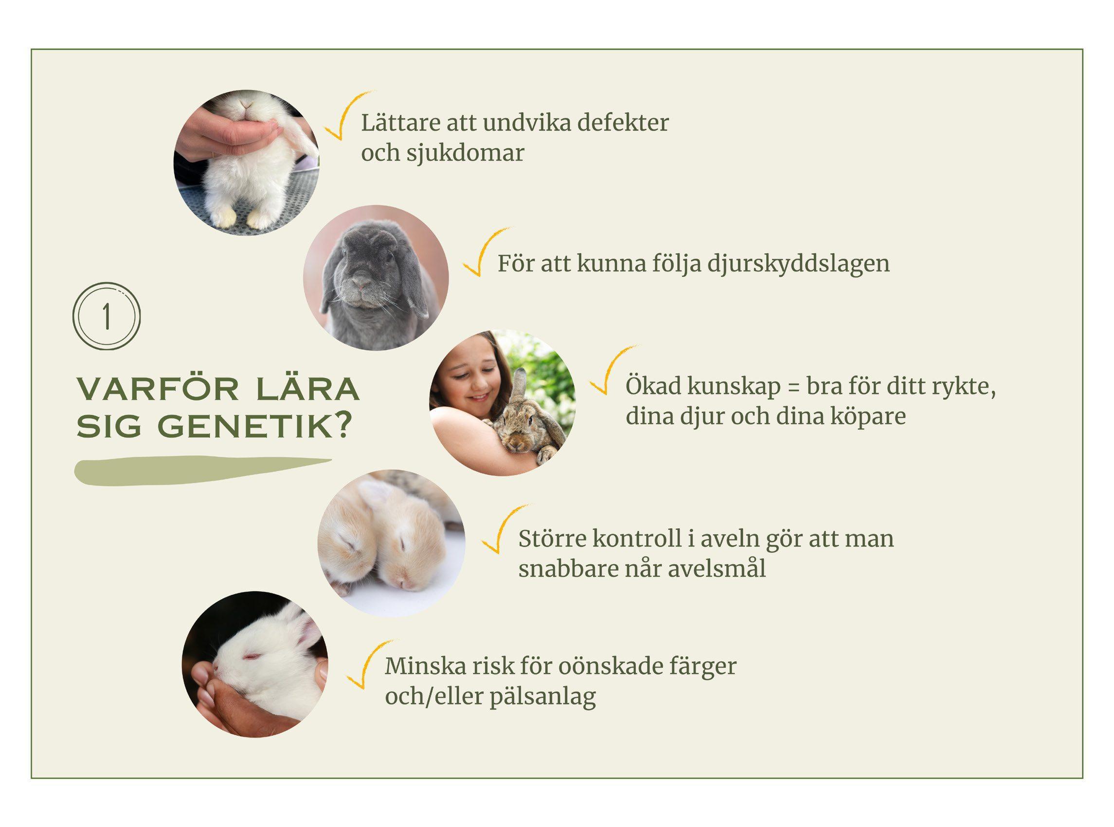Kunskapi genetik underlättari avelsplaneringen, gör detlättare attundvika defekter ochenklare attförutsäga resultatet ikullarna. Detminskar risken föroönskade färger/anlag förutställning ochduslipperfåfärgersom är svårsålda. Ökad kunskapärbra fördittsjälvförtroende, dina djur ochdinaköpare. Detger en helt annan glädje ochmotivationidittavelsarbete!