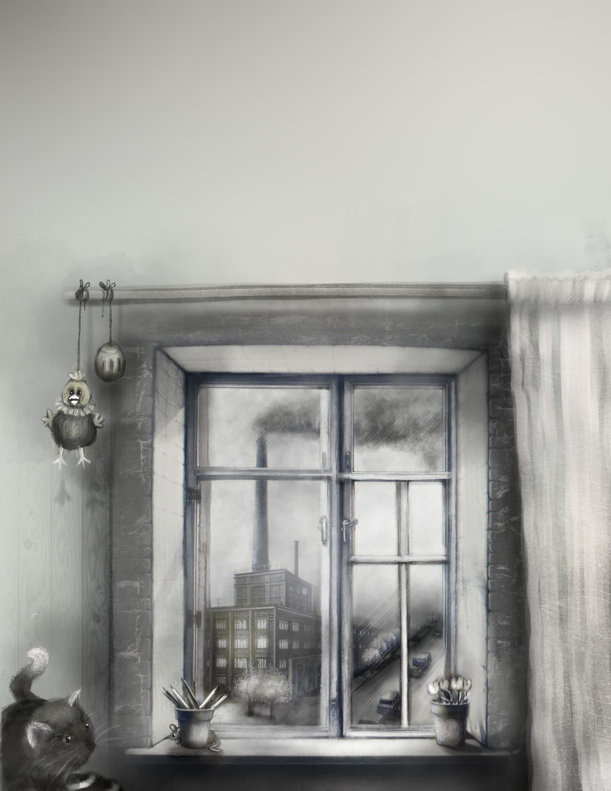 Längsmed gatan växte det träd med bruna stammar och grå löv, som föll av på hösten. På andra sidan gatan låg en mörkgrå fabrik med en hög skorsten, ur vilken det bolmade grå rök. Himlen var alltid grå, vare sig solen sken eller det var mulet och regnade.