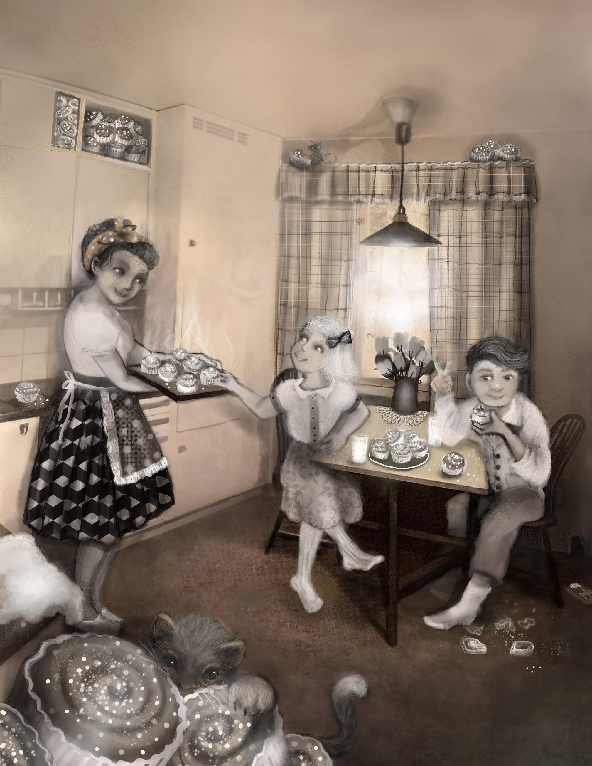 När det blev jul tog man in en gran, som stod så grå och grann i stugan, fylld med grå och svarta och vita julgransprydnader. Och sen kom tomten i sin grå vadmalsdräkt, och delade ut presenter med grått omslagspapper. Och samma sak vid påsk, massor med grå påskkycklingar överallt.