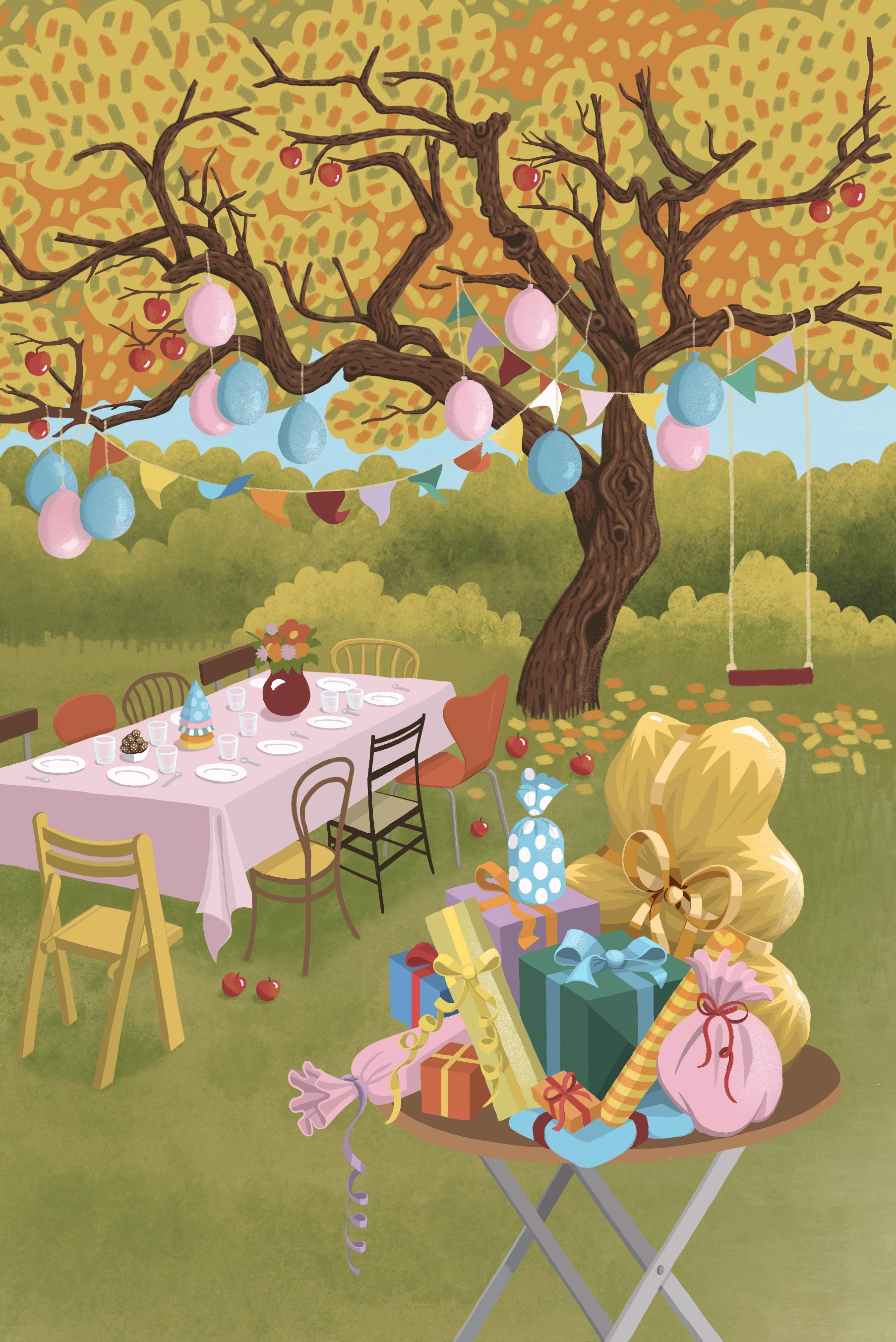 I grenarna på ett knotigt, gammalt äppelträd hängde rosa och blå ballonger fastknutna i långa snören. Under trädet stod ett dukat bord med glas och tallrikar. Mitt på bordet stod en vas med vackra blommor i alla möjliga färger.