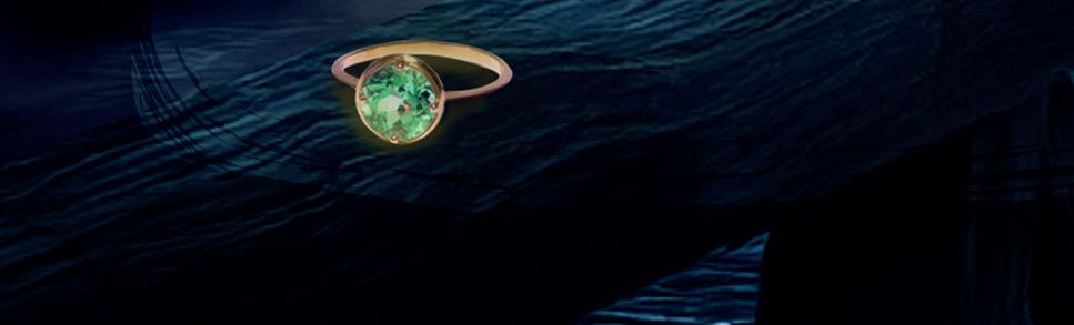 Just då blinkar det till i det övergivna tornet borta vid Svartö slott. Strålen letar sig fram till ringen och får stenen att lysa upp en tiondels sekund, som ett gnistrande grönt fyrverkeri.