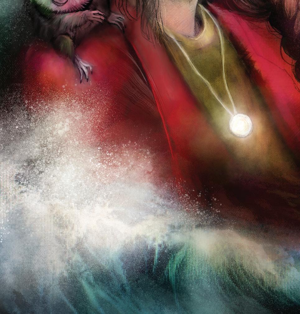 Hararna vid Älvins sida gnydde till och tryckte sig mot hans ben. Älvin kisade mot träden för att se bättre. Var det någon där bakom stammarna? En mörk reslig skugga närmade sig långsamt. Allt eftersom den kom närmare tycktes den bre ut sig och bli större och större. Det gröna gräset på marken vek sig under mörkret som om det på en gång vissnade.