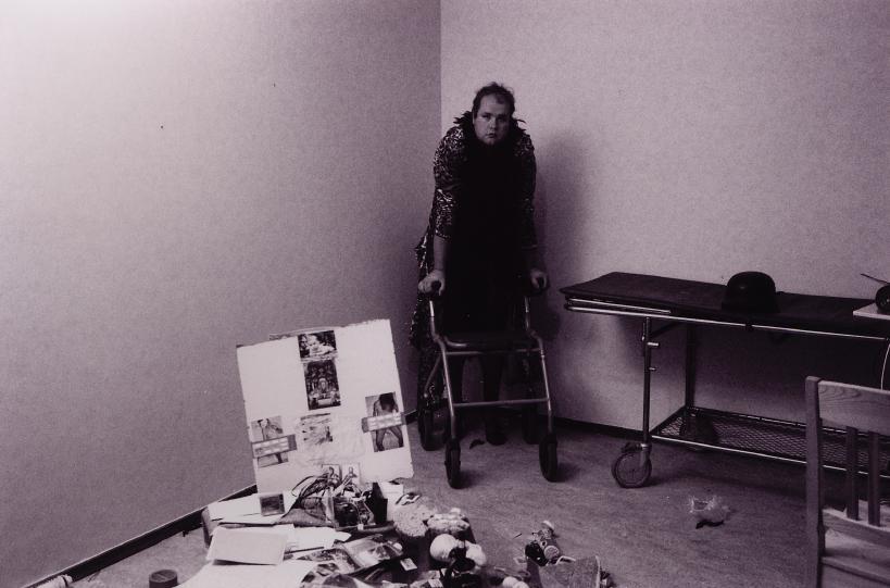 Dagis, tomt, det har halvt brunnit ner dansgolv ett tomt dansgolv, han dansar ensam, klädd som tjej, ljuset musiken allting är för honom köpcentrum