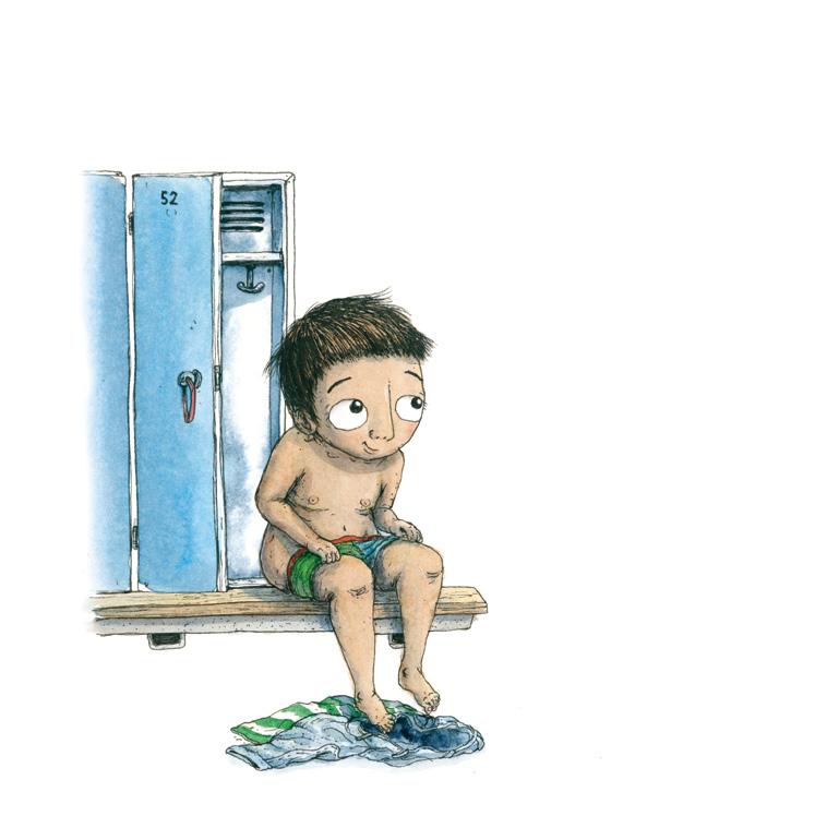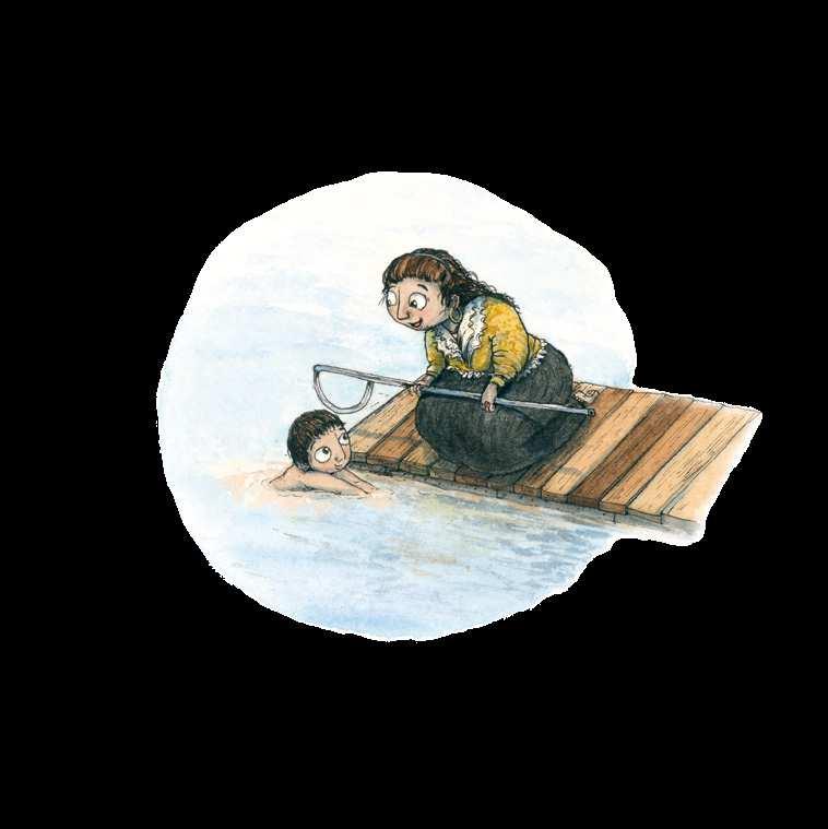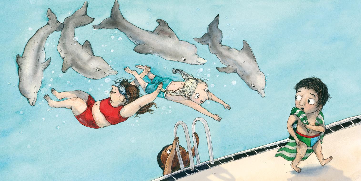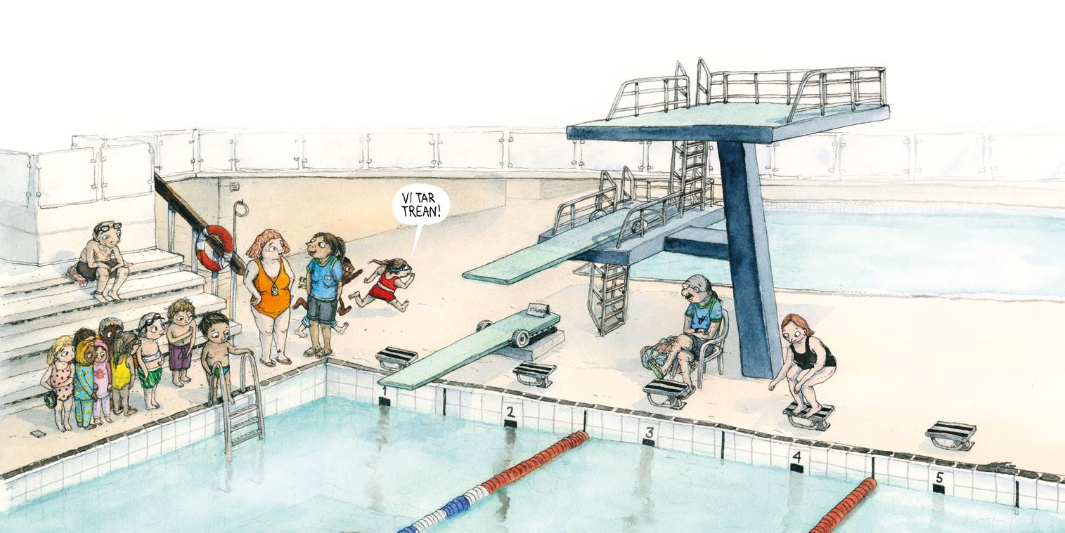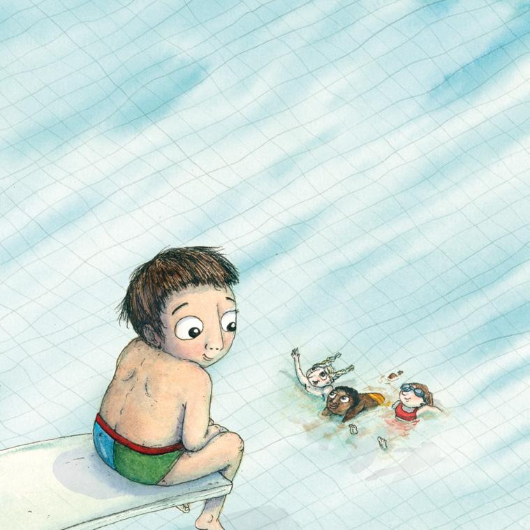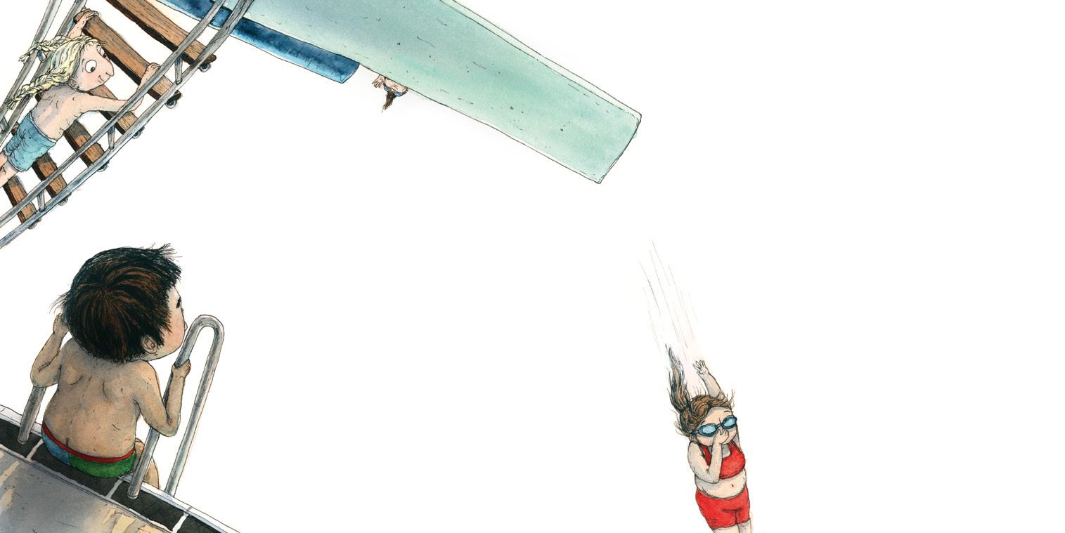 – Kom Mertsi, hoppa du med! ropar Hilma. Mertsi vill hoppa. Men inte nu. – Det är för kallt, säger han. Kan vi inte leka på det grunda istället?
