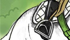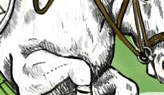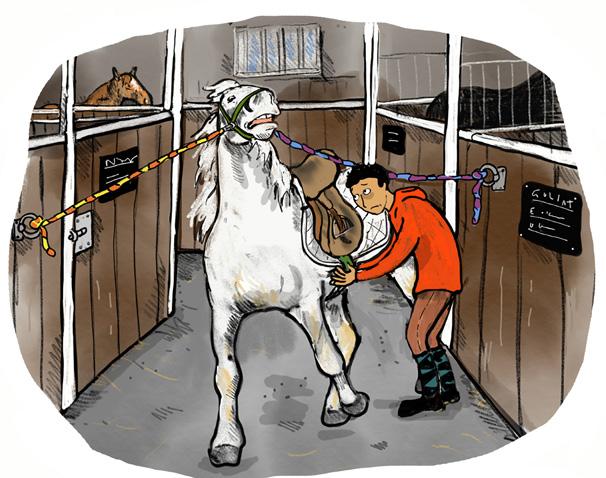 Fredag. Jag försöker få mina steg att låta bestämda när jag går till Goliat. Jag ska göra honom klar till hoppträningen. Mina händer darrar när jag öppnar dörren till boxen. Som vanligt lägger Goliat öronen bakåt. Han kommer emot mig med öppen mun. Men jag är beredd med grimman. Snabbt drar jag den över hans huvud. Jag aktar mig för hans tänder. De slår ihop precis bredvid min hand.