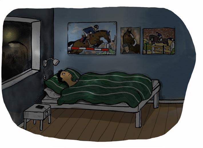 ovanför sängen. Jag ser på Malin Bayard. Hon och Flippan hoppar över ett högt hinder. Det var när de tog silver i OS. Tänk att kunna rida som hon!