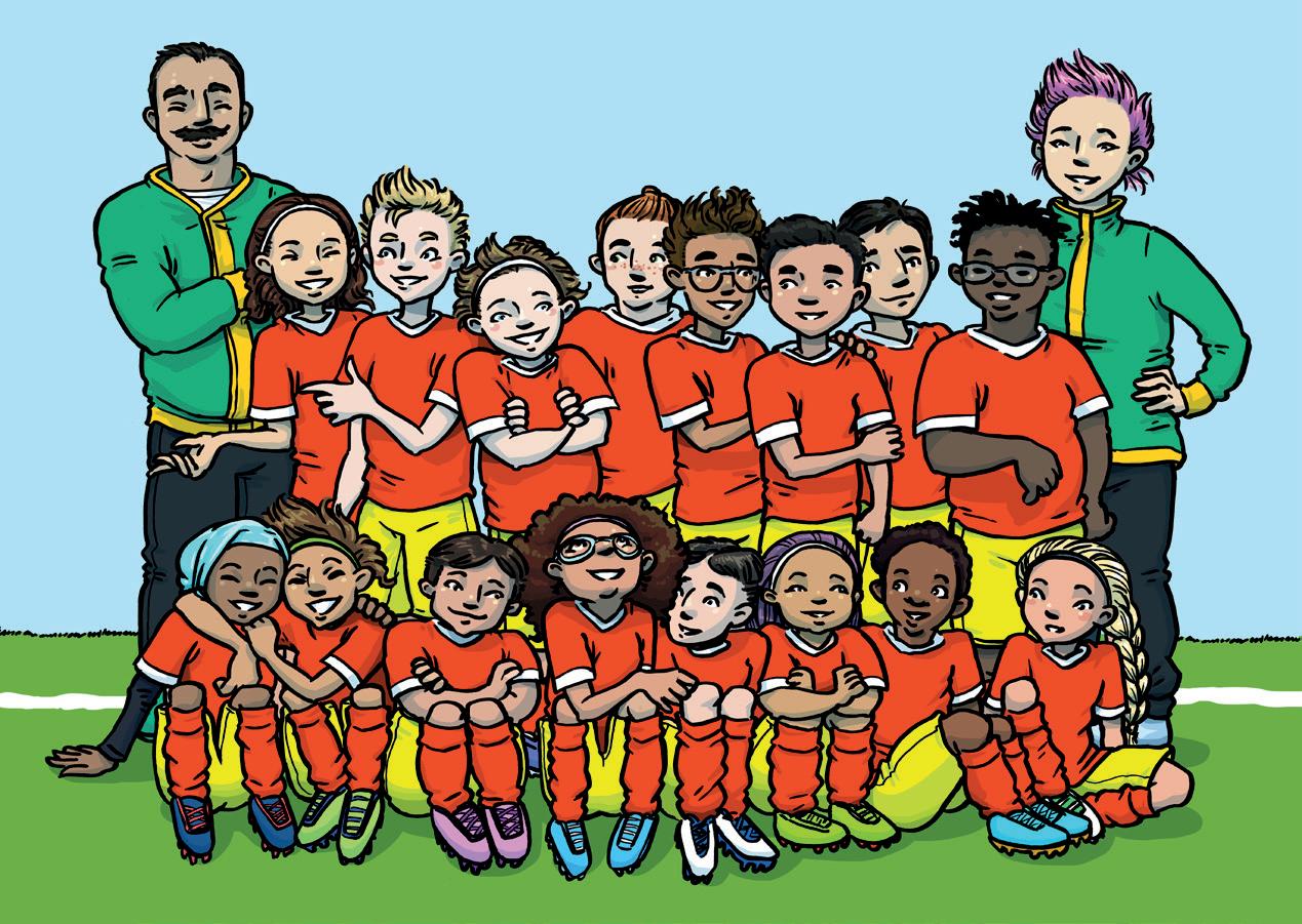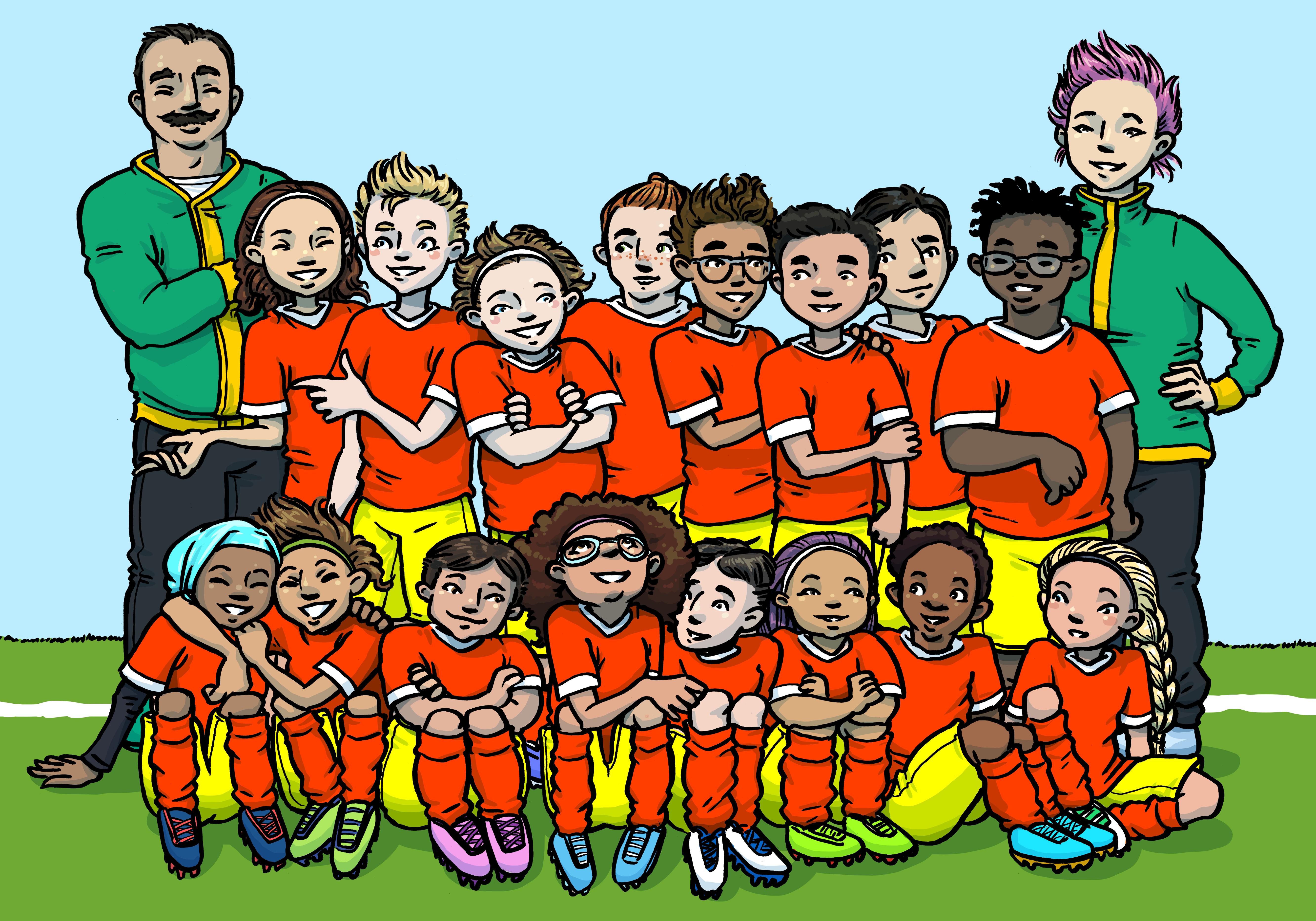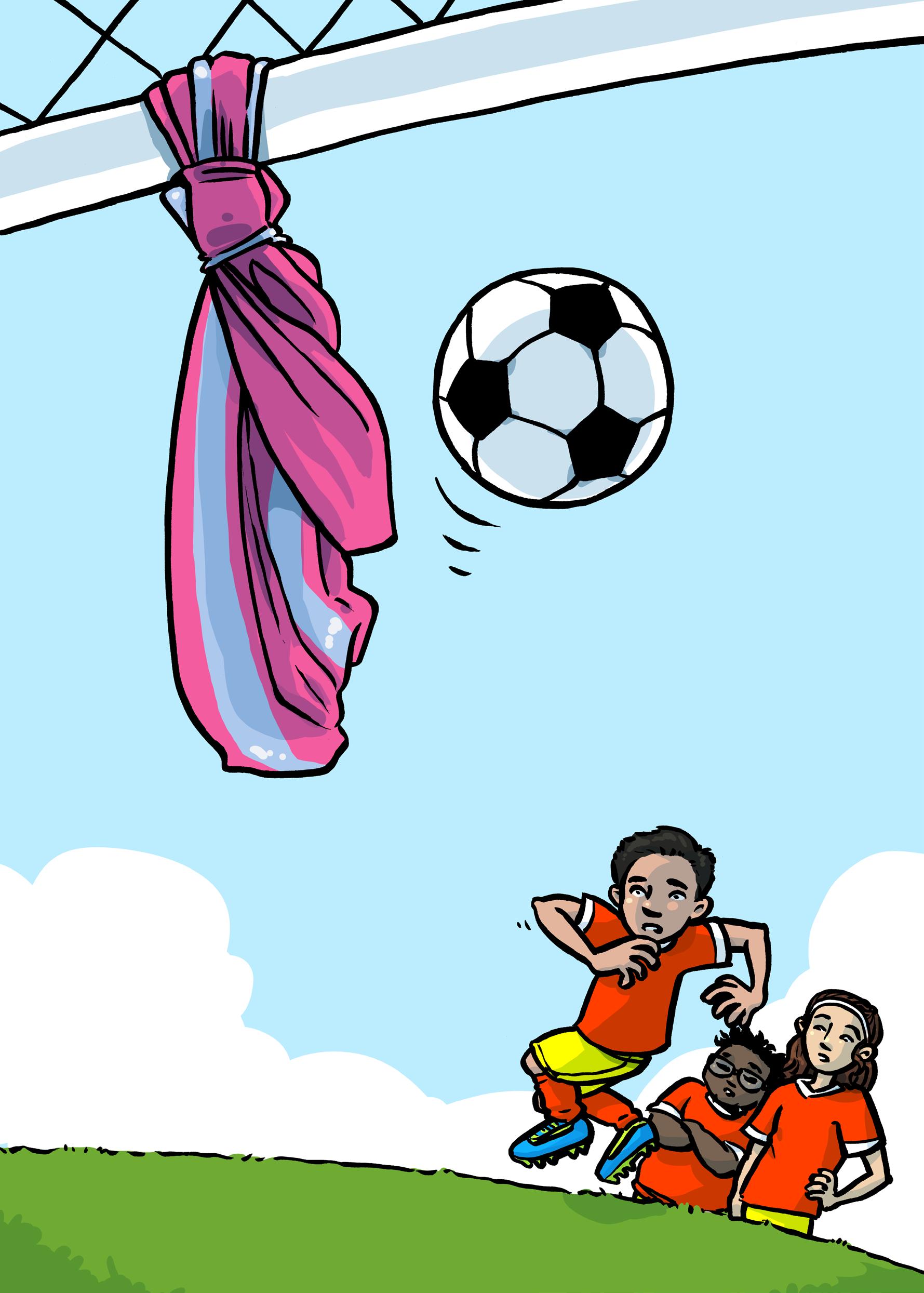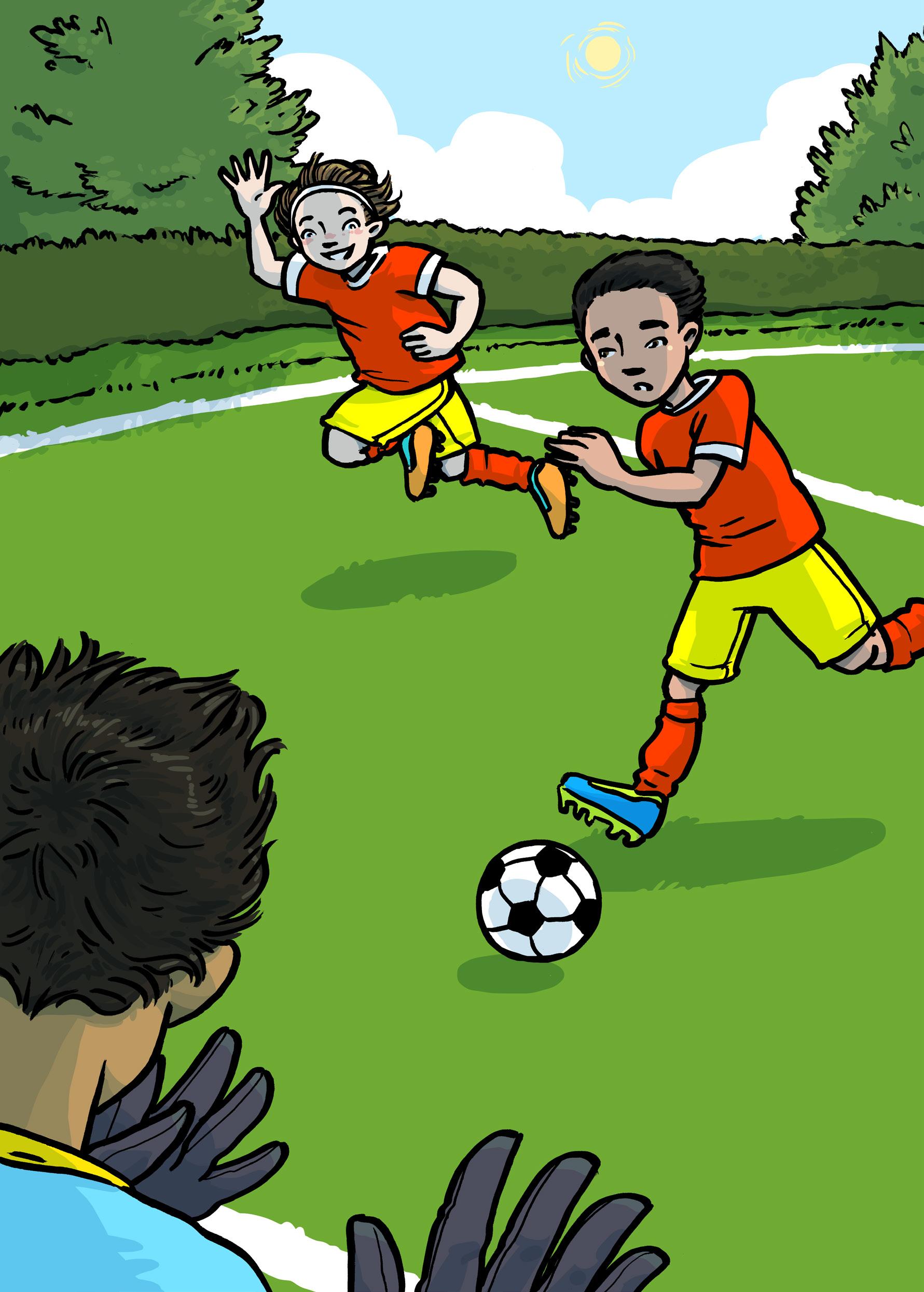 Behrang joggar med nedböjt huvud in i målet och plockar ut bollen. I ögonvrån ser han Signe sitta i slänten precis bakom kortlinjen och dricka sin äppelmust. Hon vinner en must nästan varje gång. Det ilar till i Behrang av avundsjuka, men han försöker tänka att han måste träna mer.