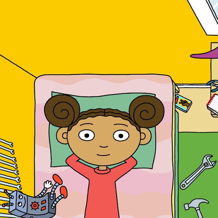 Men idag är hon ledig. Hon ska inte gå till skolan, och hon ska inte uppfinna någonting alls. Att ligga på rygg och bara glo är också en viktig del i en uppfinnares liv. Hjärnan måste vila ibland.