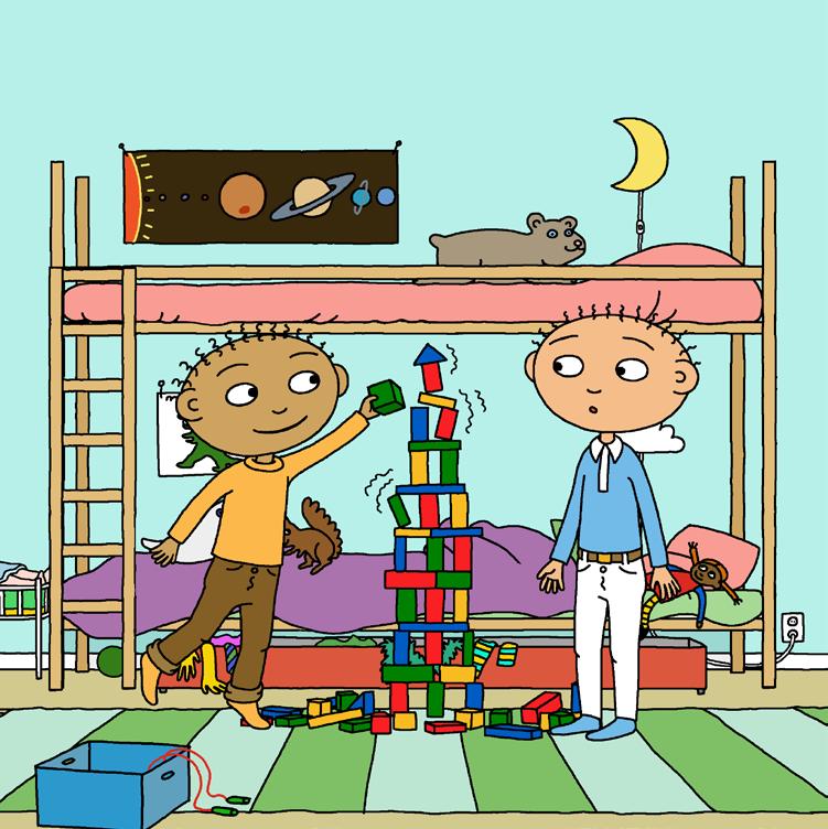I rummet bredvid leker Johannas bröder, Sten och Stanley. De bygger ett torn som ska bli högre än Sten ...