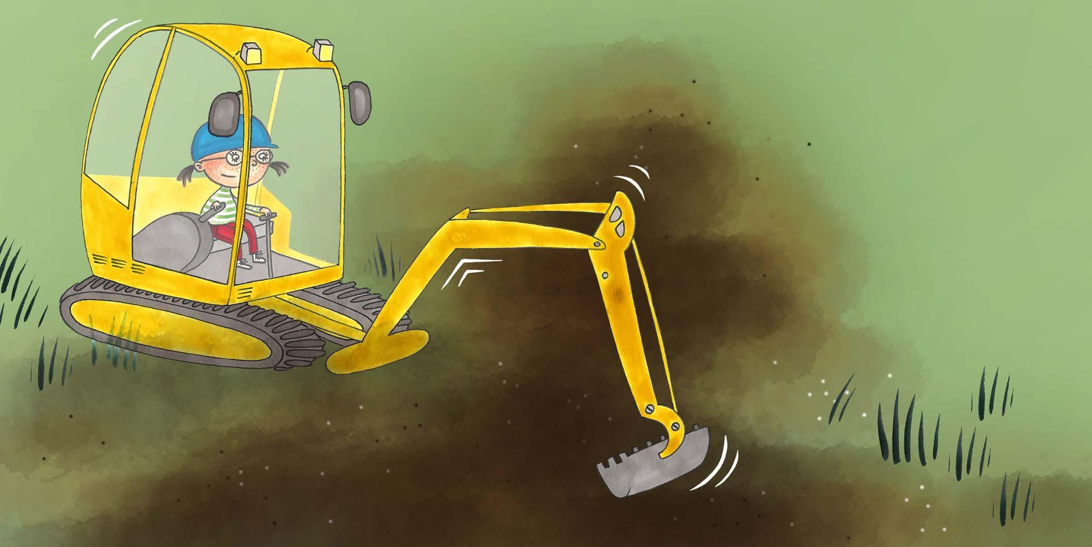Hon drar i spakarna. Skopan gör en stor fin grop.