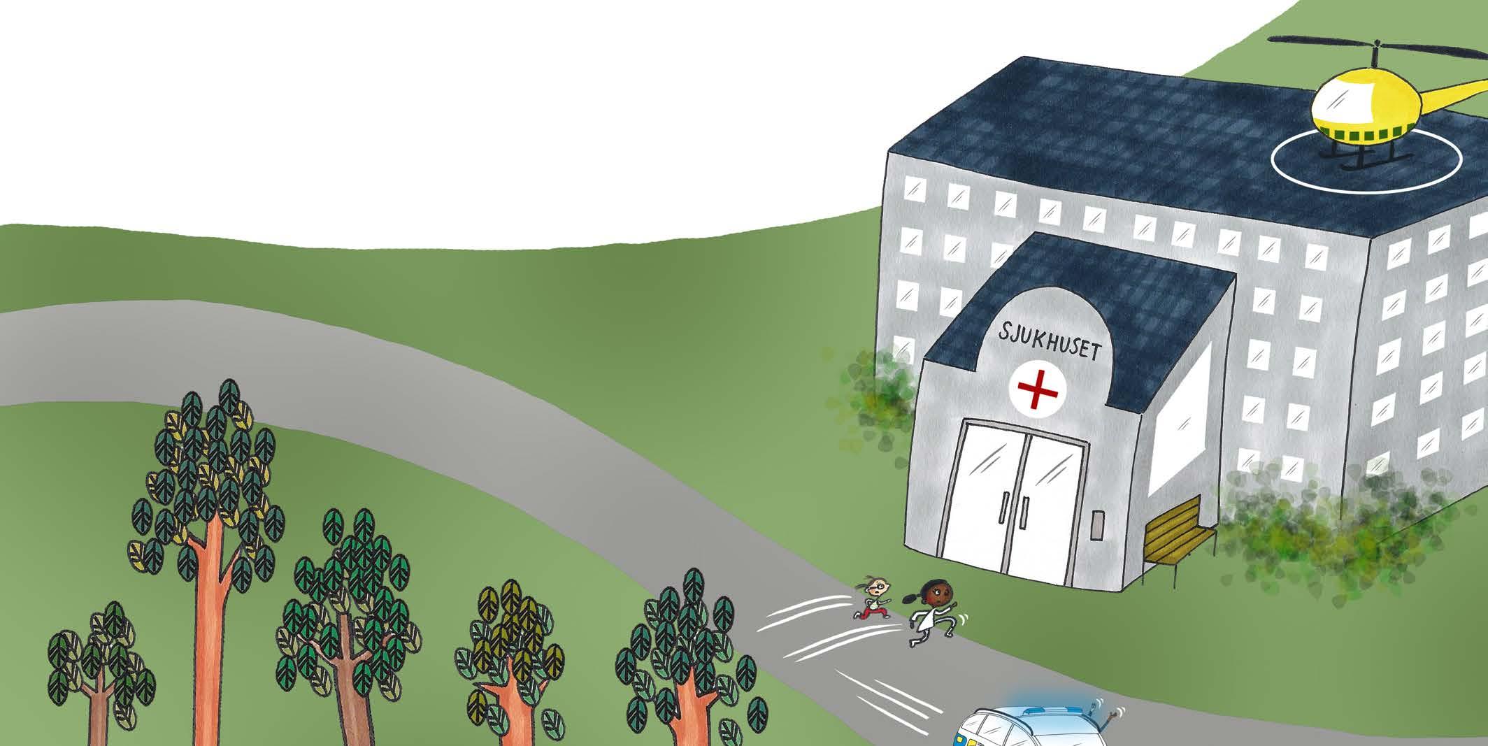 Bilen bromsar in framför sjukhuset.