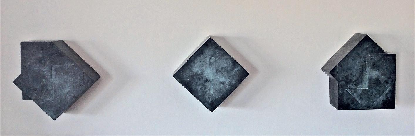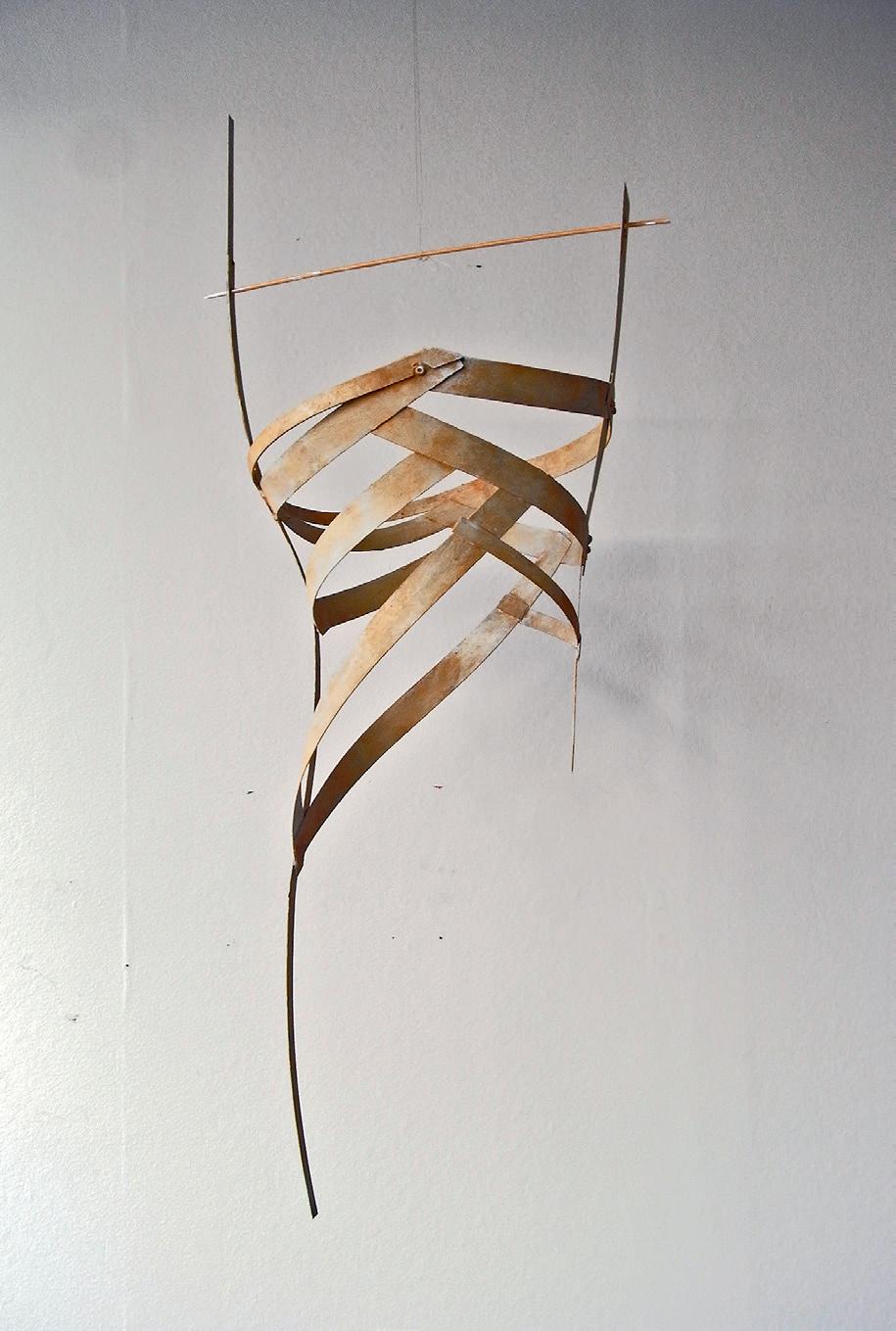 Några av skulpturerna är svävande former i flygplansplywood med en självklar spänst och elegans i formspelet. Andra är geometriska reliefer i tung mörk brons. Ett återkommande motiv är kedjor som hon gestaltat i olika material.